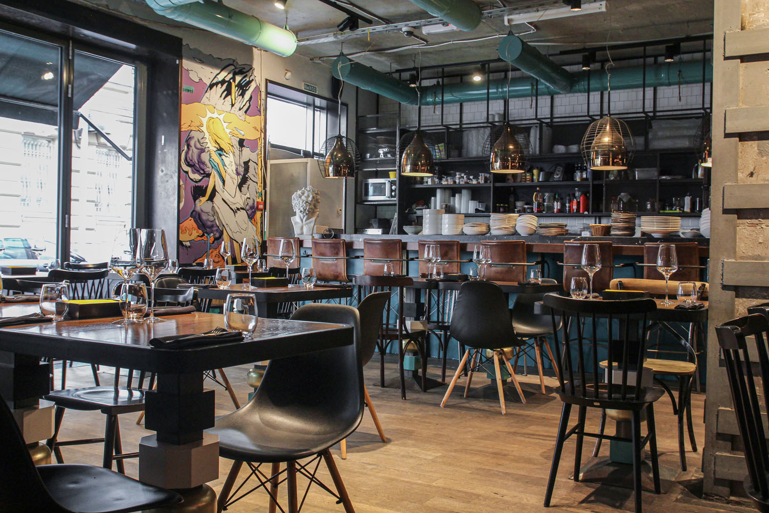 В оформлении 15 Kitchen+Bar присутствуют грубые металлические конструкции, дерево, яркие замысловатые элементы декора и мебели.