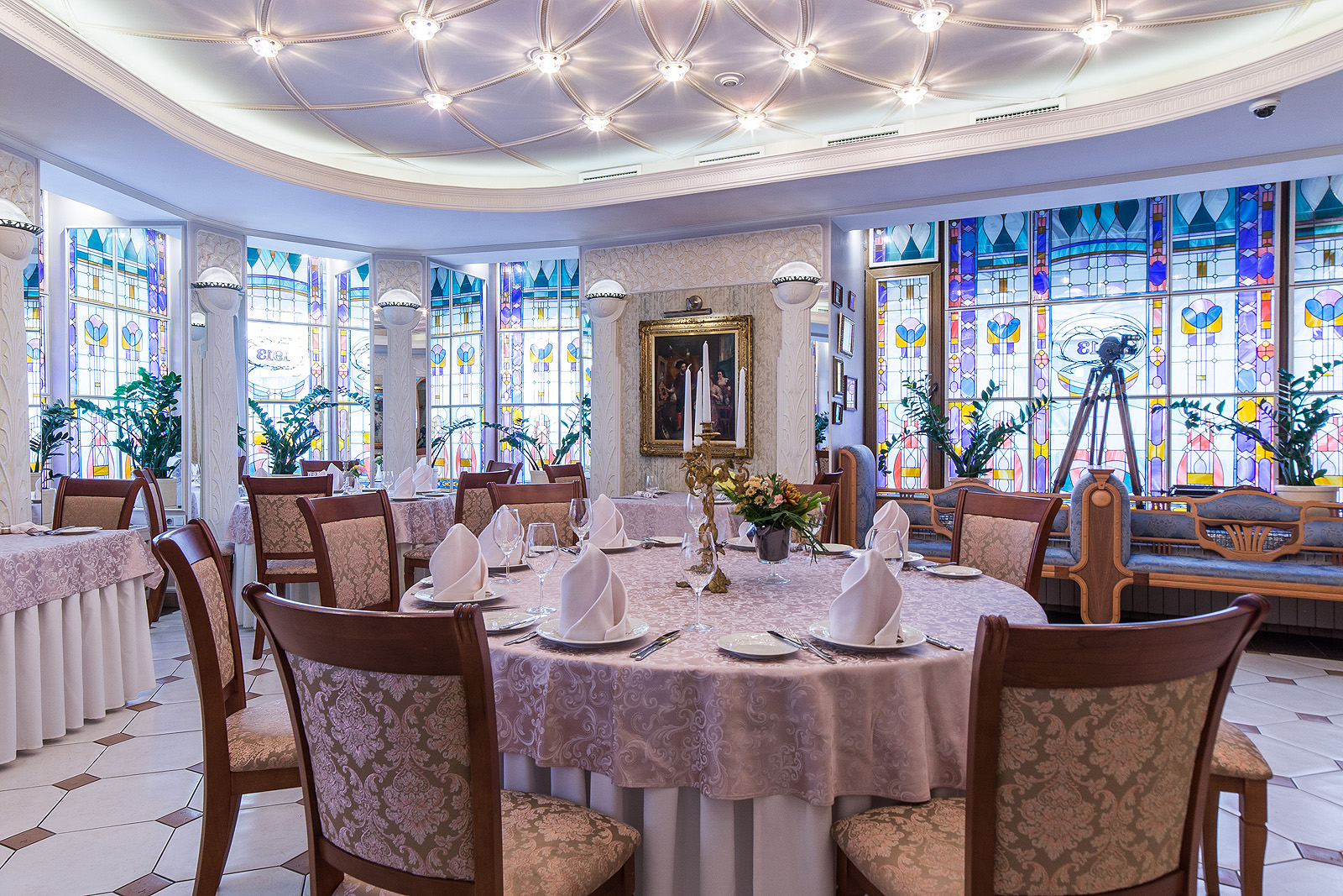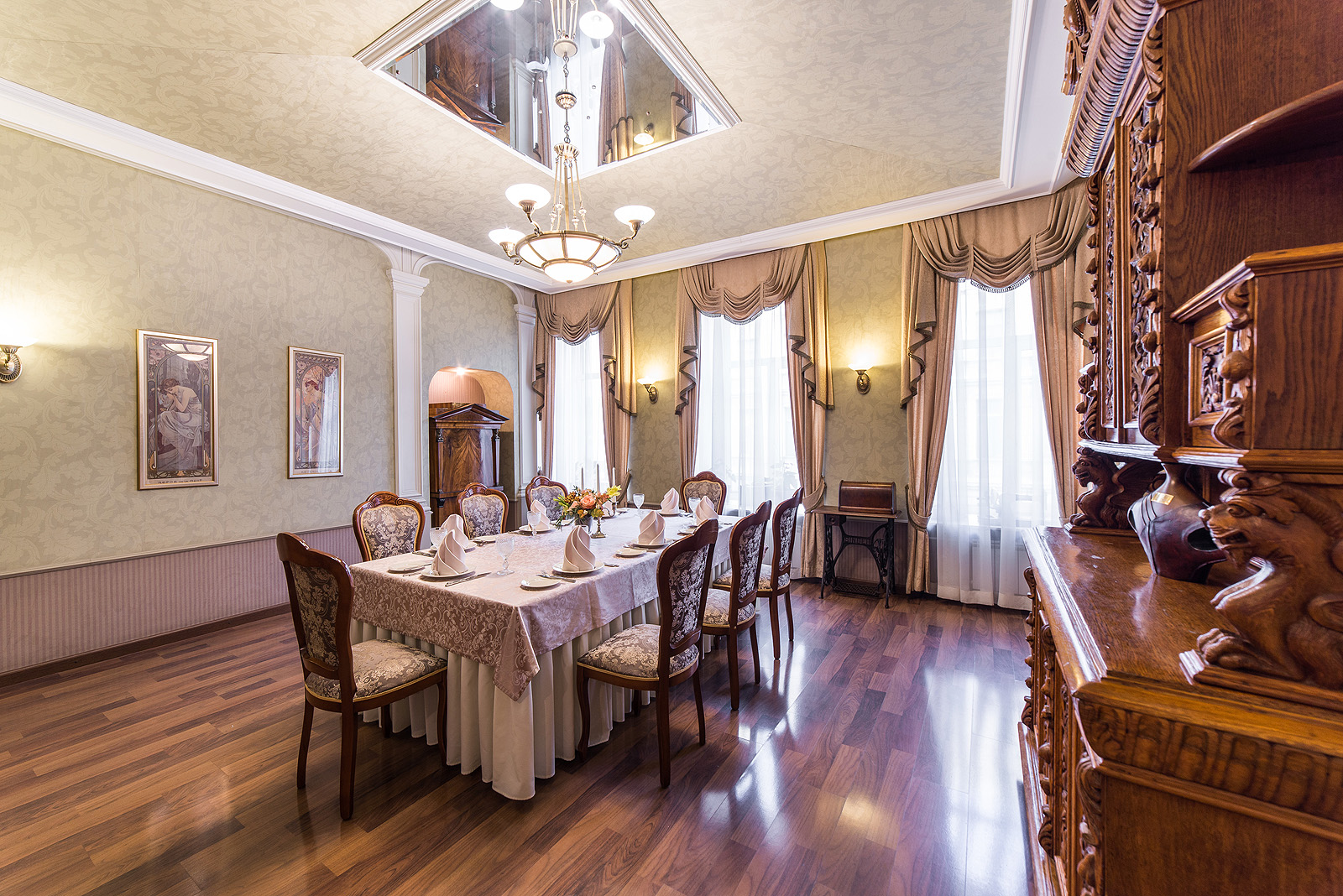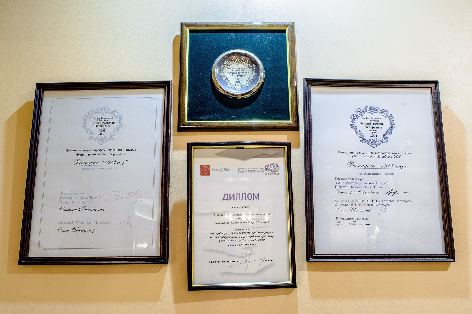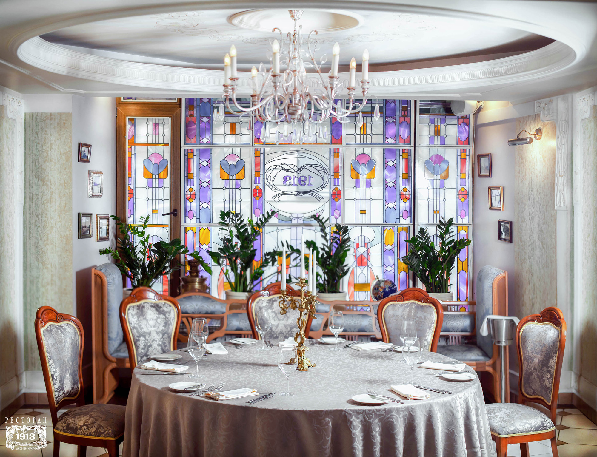 Ресторан 1913 на Вознесенском проспекте находится в центре исторического Петербурга при одноименном отеле. К услугам гостей три зала разной вместимости и дизайна, объединенные общим стилем ар-нуво с плавными линиями, гармоничной палитрой и роскошными витражами. Основной зал отличается парадной обстановкой и подходит для масштабных событий. В интерьере использованы антикварные предметы мебели и декора: часы, резные буфеты, вазы и подсвечники. Высокие окна украшают разноцветные витражи, стены — картины в золоченых рамах.
