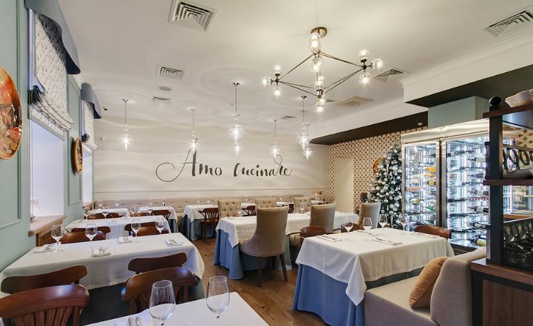 Amo Cucinare можно рассматривать как ресторан на каждый день и ресторан для особого случая. Днем во время бизнес-ланчей заведение выглядит более демократично, вечером атмосфера меняется и обстановка становится более торжественной, свет более приглушенным.