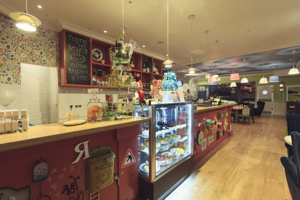 При входе в АндерСон гостей встречает традиционно уютный и очень домашний интерьер: столики с удобными диванчиками и мягкими креслами, детские рисунки на стенах, оригинальная барная стойка и сверкающая витрина, заполненная фирменными десертами, ягодными тартами и свежей выпечкой. Ассортимент и сладкое разнообразие здесь, к слову, точно такое же, как и в больших кафе сети.