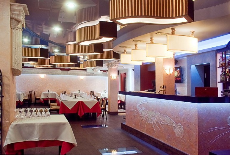 Классический европейский интерьер в светлых и золотистых оттенках, утонченный и одновременно уютный, мягкий свет, приятная фоновая музыка. Встречает гостей символ ресторана - лангуст,вылепленный прямо на барной стойке.