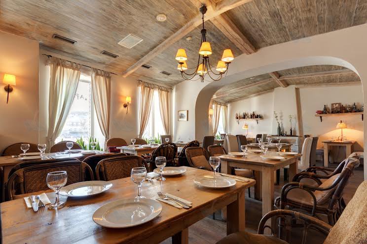 Благородный интерьер ресторана располагает к комфортномуи спокойному отдыху: на окнах – живые растения, белые стены украшают полки с деревяннойутварью, а в глубине небольшого зала расположен декоративный камин, похожий на печь вгостеприимном грузинском доме.