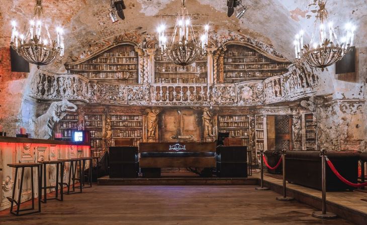 Фреска с изображением антресоли и старинных книжных полок отсылает к прежнему назначению пространства. В противоположной стороне зала расположен второй ярус, воплощающий собой современную интерпретацию картинки из прошлого.
