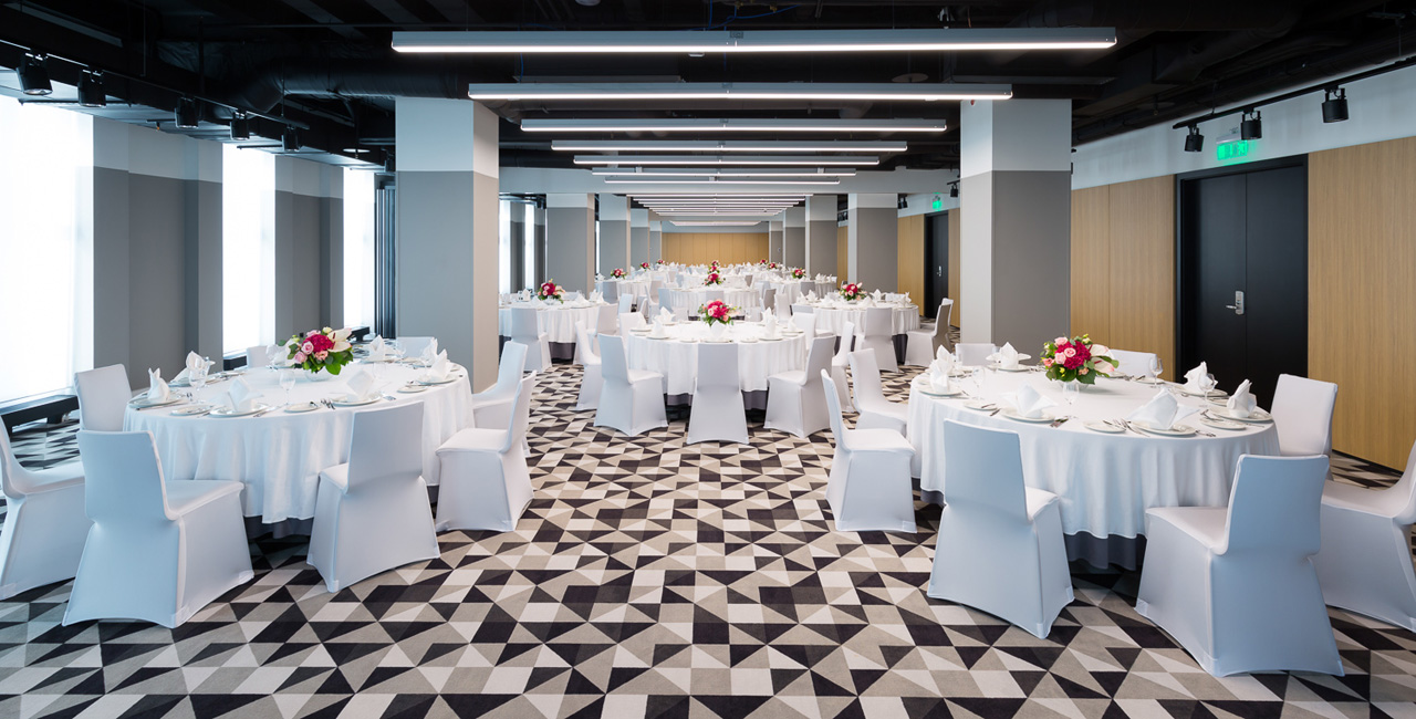 На 20 этаже Отеля расположен зал «Арбат» с панорамными видами на центр города и площадью 180 кв.м.. При необходимости зал можно разделит на два специальными шумоизолирующими перегородками. Для проведения кофе-брейков предлагается специальная зона с видом на легендарную сталинскую высотку - здание МИД РФ. Зал подойдет как дляделовых встреч, иконференций, так идля вечеринок, свадеб идругих мероприятий.