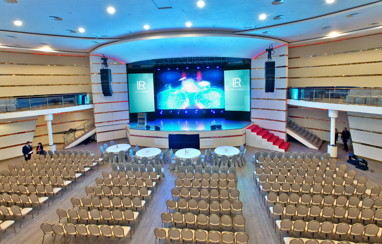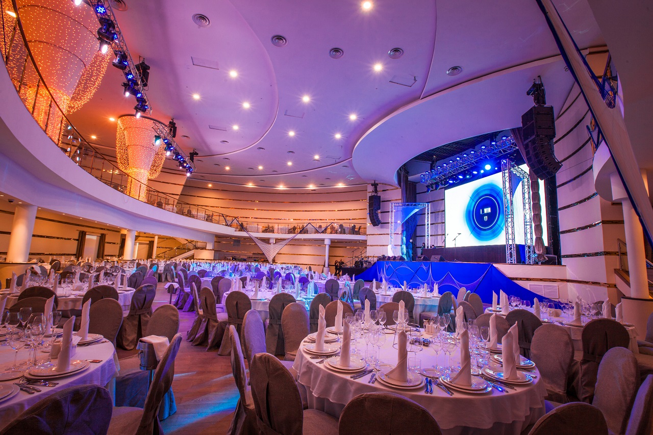 Площадка «Мир» предельно функциональна; правильная геометрия и отсутствие лишних деталей гарантируют отличный обзор сцены с любой точки зала. Многоуровневая система освещения создает уютную атмосферу, при этом внутреннее пространство соединяет легкость и торжественность. Стеклянный фасад здания со светодиодным экраном дает дополнительные возможности для брендирования и оформления.