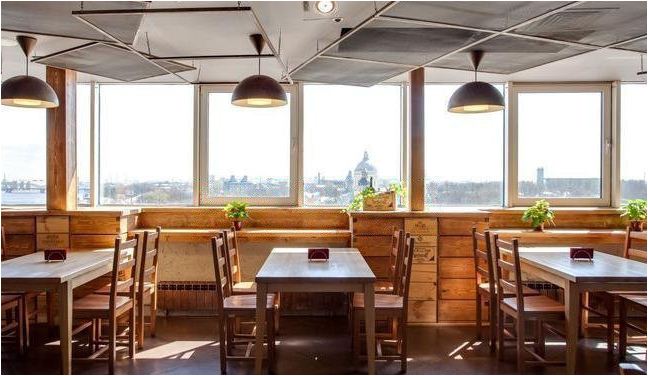 В отделке просторного светлого зала использованы только натуральные материалы: столы и стулья из некрашеного светлого дерева, оригинальная деревянная барная стойка, в которую органично вписываются винные стеллажи, шкуры на полу, много живой зелени в горшочках и ящиках. Одна стена почти целиком состоит из окон, откуда открывается тот самый вид на Неву и Лавру (стоит зайти сюда хотя бы ради него!). В одном углу зала стоит винтажный буфет, в другом – раритетный винный стол. В глубине зала – уютная зона для курящих с мягкими кожаными диванами и хорошей вытяжкой.