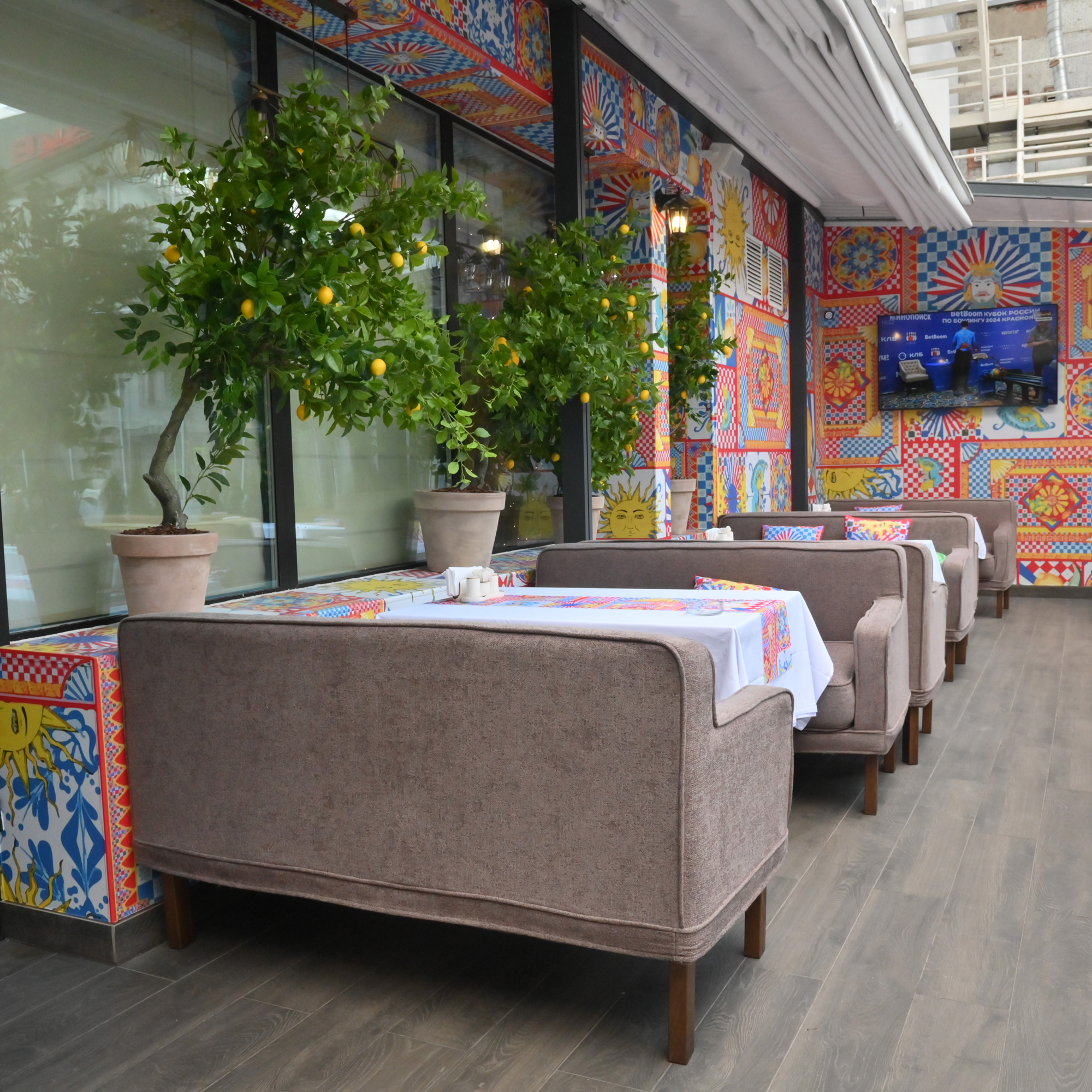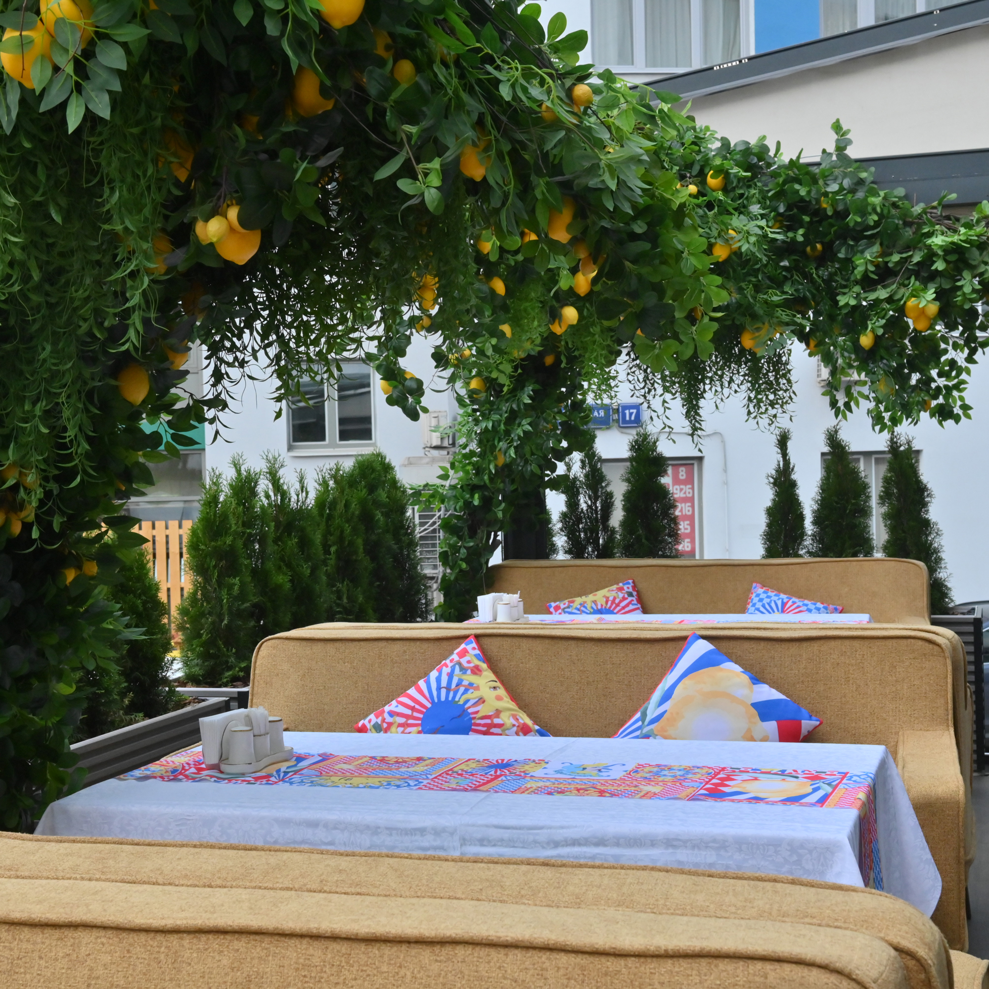 Зал имеет прямой выход на открытую оборудованную веранду, площадью более 50 кв. м, которая в летнее время оборудуется стационарными зонтами с тканевым покрытием.