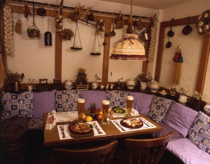 Впроцессе работыБудвар пивной ресторанобрастал множеством старинных предметов, купленных наблошиных рынках Европы. Старинные часы изГолландии, множество медной утвари— Франция, керамическая посуда изгорода Брно. Чешские соломенные куклы изг. Праги. Венки икорзиночки, букеты изсухоцветов изПраги магазина «Гортензия». Плетеные поросята исоломенные утки изШвейцарии, купленные вместечке рядом сзамком Грюер, колокольчики тоже Швейцарские, что одевают нашею коровам. Есть имножество подарков отгостей— старинные утюги, лампы, грелки, ухваты, борона, грабли. Огромная корзина, деревянные ложки, пивные керамические кружки иштоф откорреспондента Дарьи Цивиной. Есть бельгийская грелка, вкоторую насыпаются горячие угли, использовали раньше, чтобы согреть холодную постель. Голландские зольники для удаления золы изкамина. Старинные колокольчики, чтобы тушить свечи.