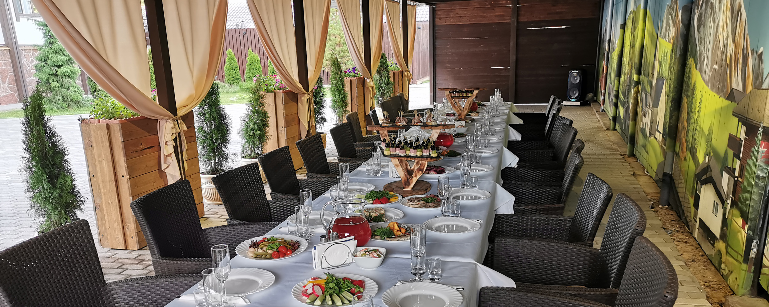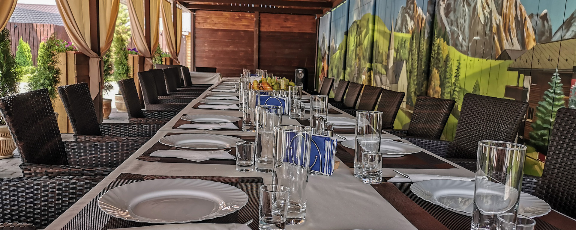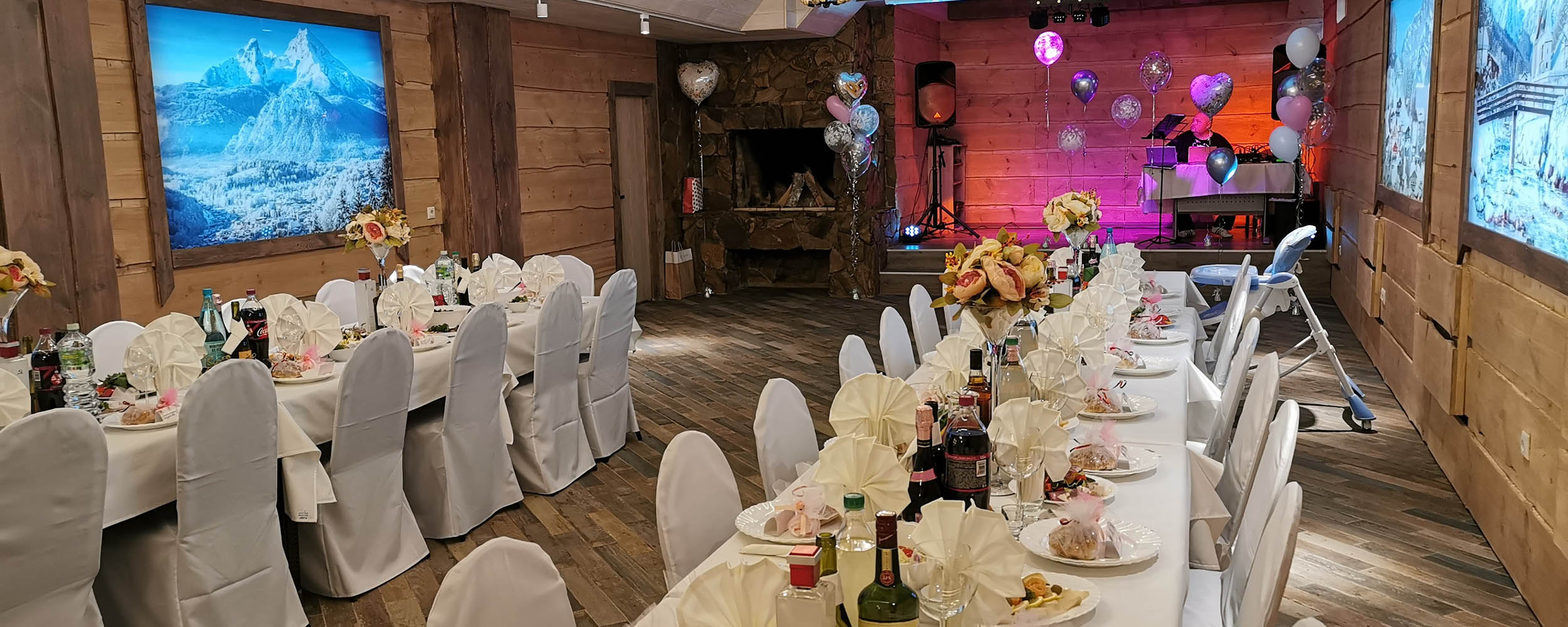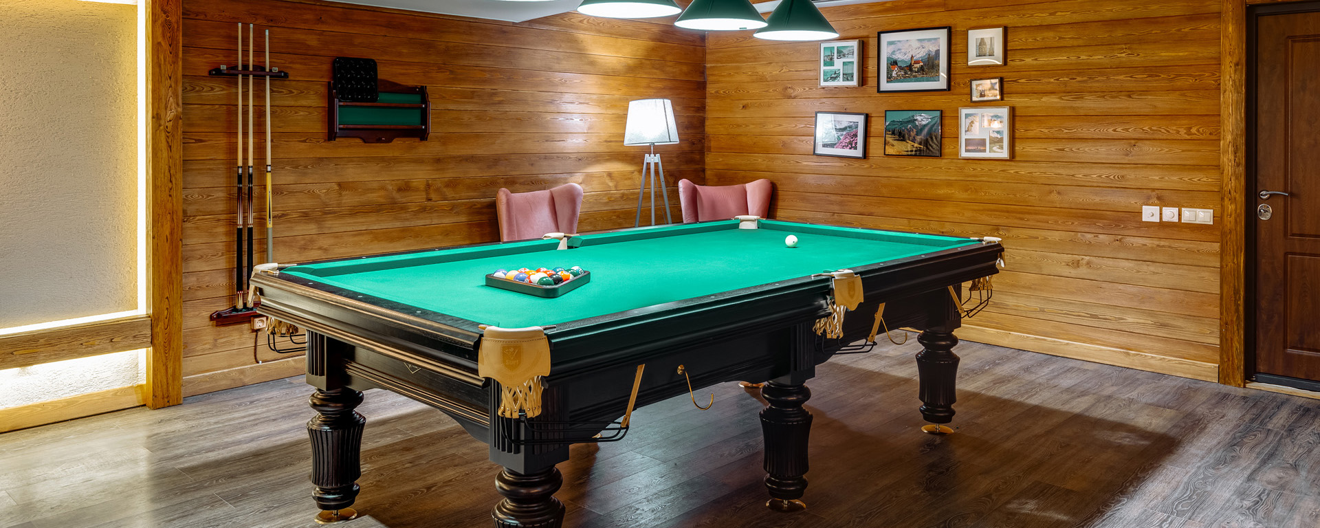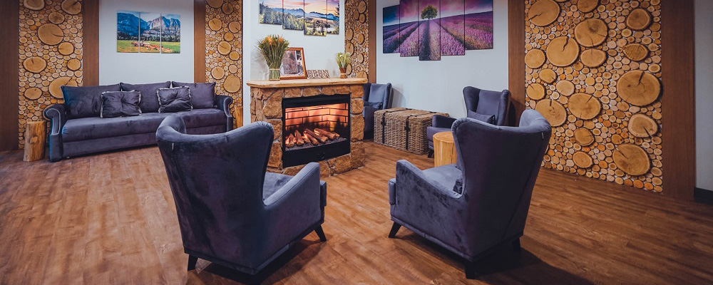 В лобби загородного клуба можно отдохнуть в мягких креслах у камина, интерьер украшаютдекоративные элементы из камня и натурального дерева. В Chalet Сountry Сlubесть банкетныйзал, оформленный в швейцарском стиле, уютно смотрящийсявтёплом свете керосиновых ламп.Менюзагородного клуба может порадоватьсамого изысканного гурмана авторскими блюдами европейской кухни и традиционными швейцарскими деликатесами.Залоснащенпроекционным оборудованием с большимэкраном для кинопоказов и современной системойкараоке.