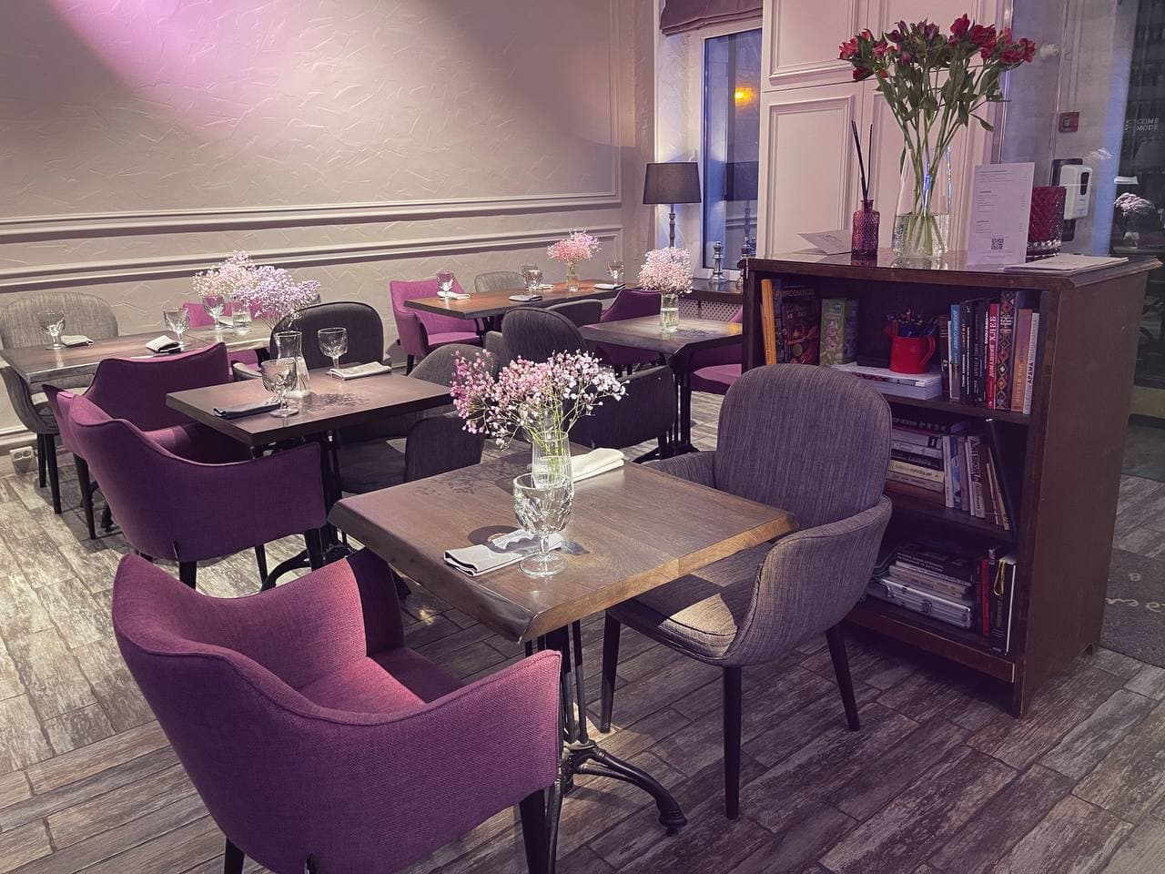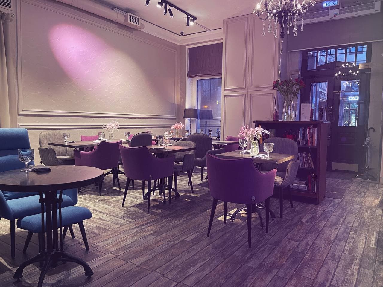 Элегантная классика — эти два слова полностью описывают интерьер заведения. Светлые стены, большая роскошная люстра из латуни с крупными кристаллами, римские шторы карамельного оттенка на огромных окнах. Кремовые оттенки стен и плотных шелковистых драпировок, тумбы и столики тёмного дерева — приятный контраст, в котором третьей нотой выступает обивка кресел насыщенного вишнёвого оттенка. Вкрапления бирюзового и серого выглядят здесь скорее нюансами, не нарушая сбалансированную общую тональность. Свежие цветы прекрасно дополняют общую картину.