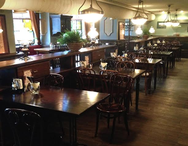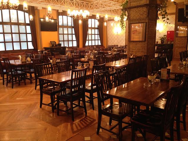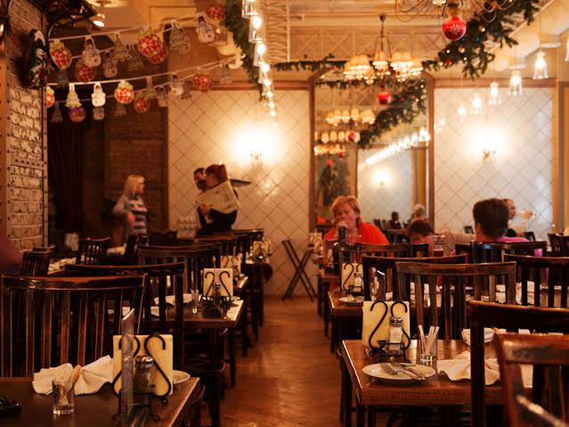 Интерьер ресторана выполнен в дореволюционном стиле c дополнением cовременных элементов, с использованием дерева и кирпича. Теплый свет и высокие потолки создают торжественную обстановку.