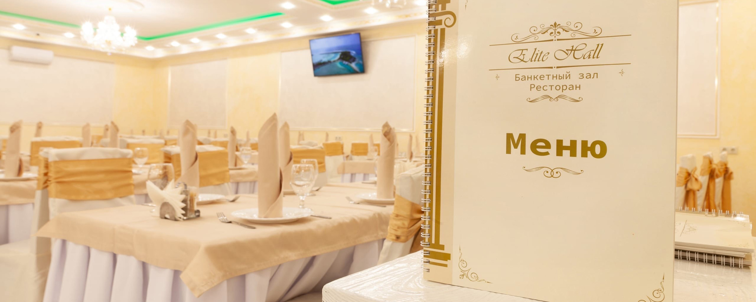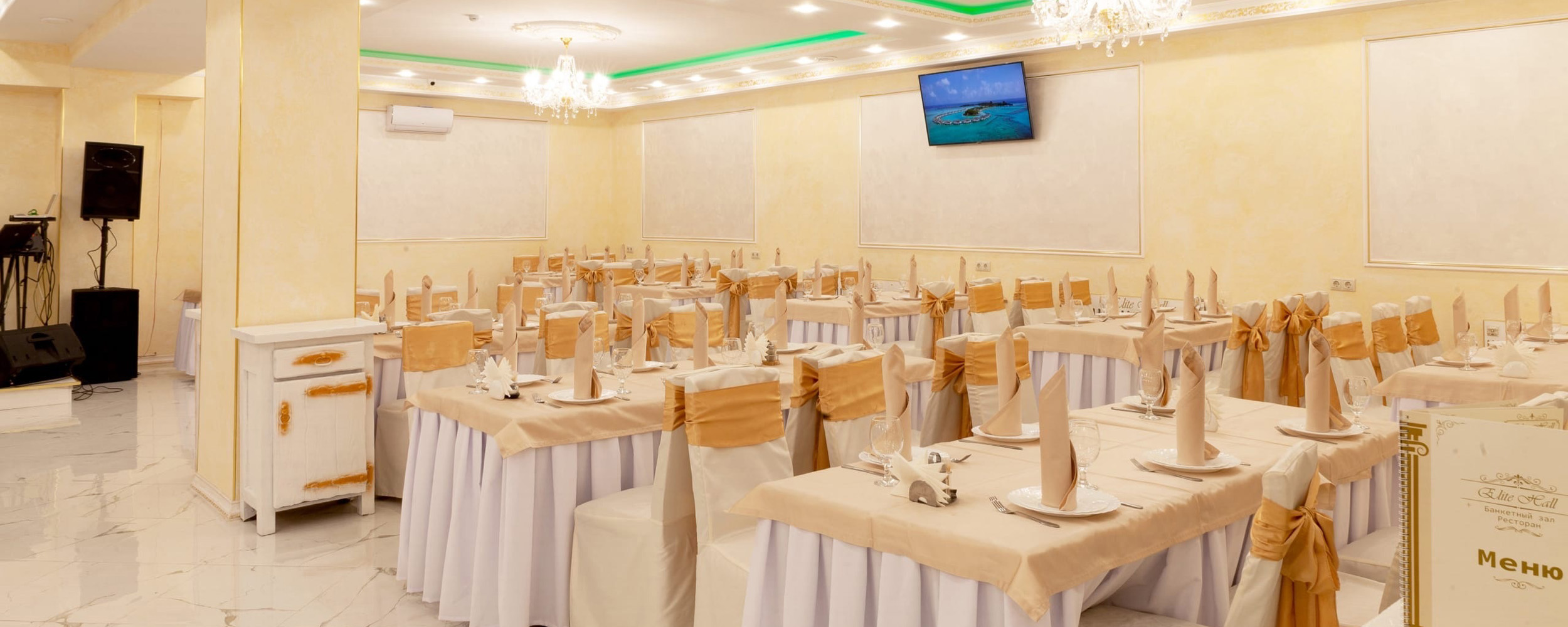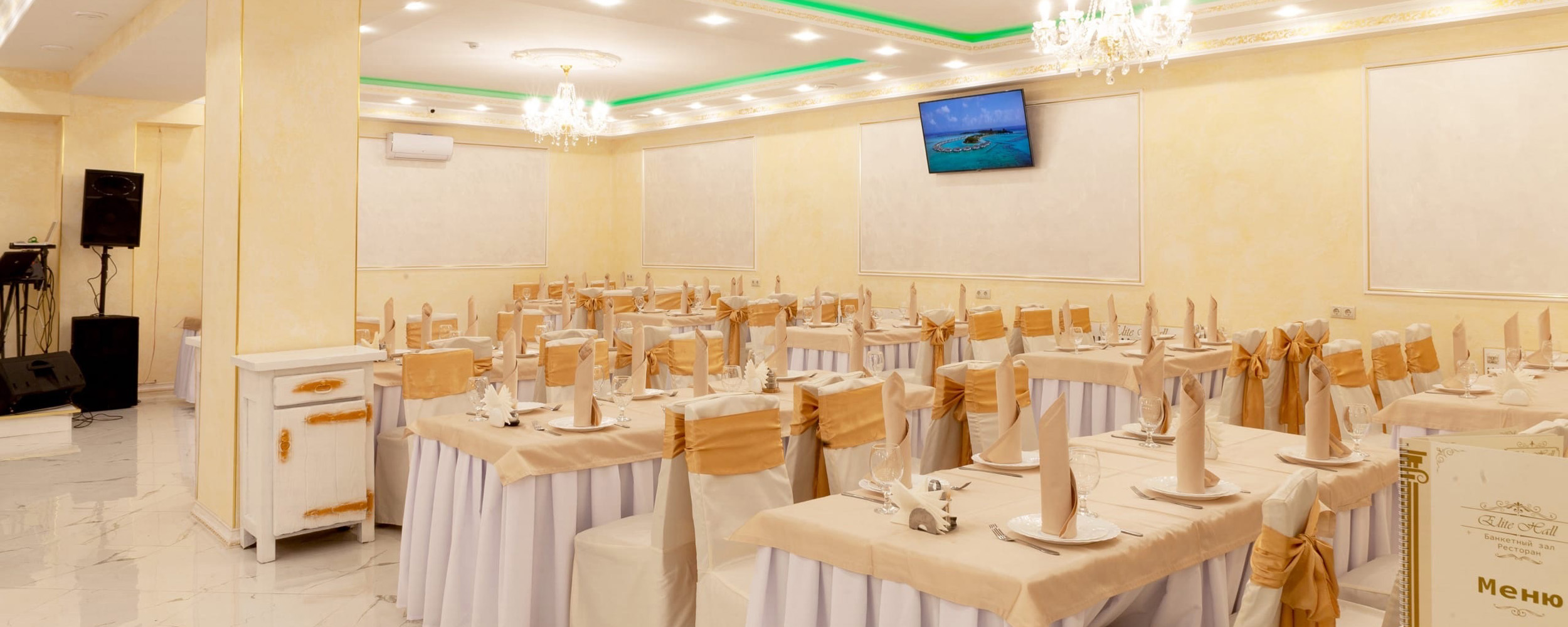 Банкетный зал ресторана «Elite Hall» рассчитан на 200 человек при банкете или на 300 человек при фуршете.