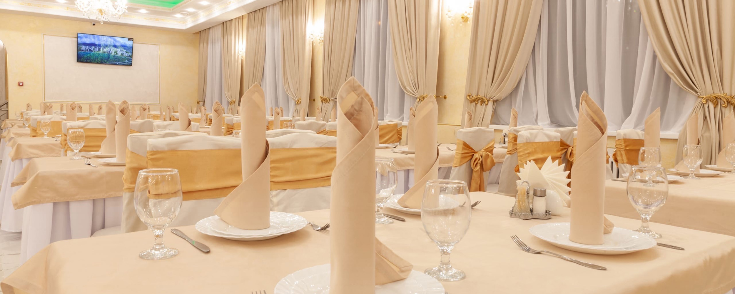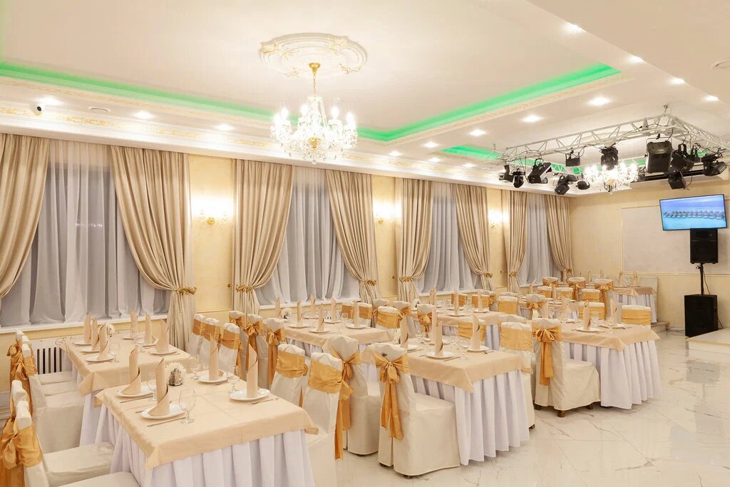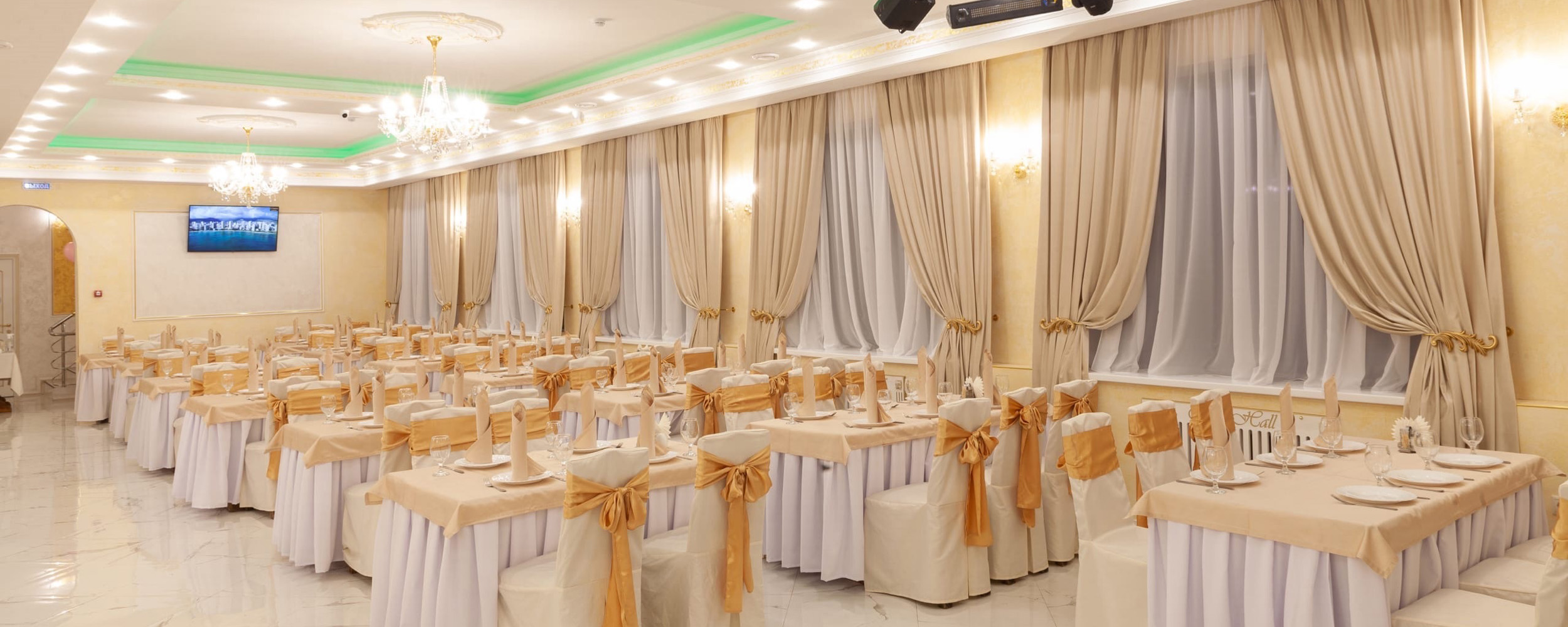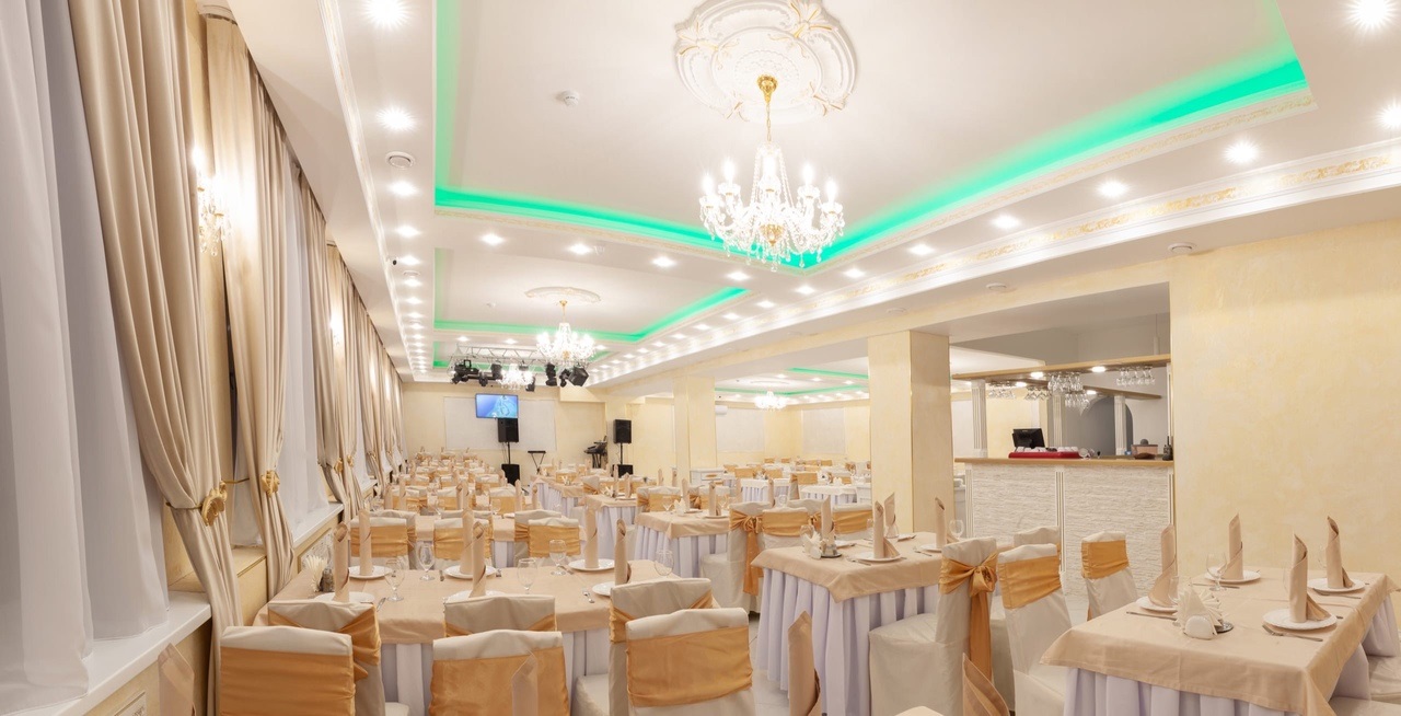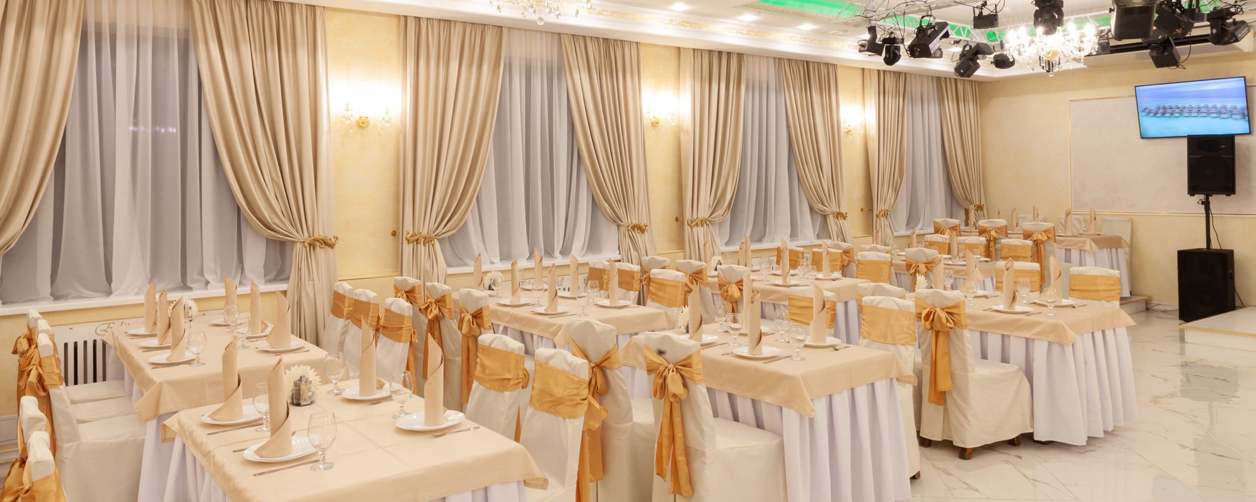 Описание банкетного зала: зал имеет отдельный вход для гостей заведения. Обстановка в зале торжественная и элегантная: интерьер банкетного зала исполнен в бело-золотых тонах, - идеальный выбор для организации свадеб, юбилеев и корпоративных мероприятий.
