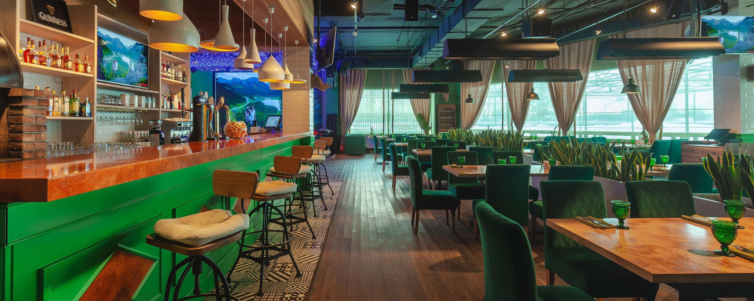 Интерьер «ФаZенды» — это сочетание удобной модной современной мебели и элементов под старину: кованых светильников, стеллажей, дубовых полов. Главный цвет интерьера — зеленый. Это цвет чистоты, спокойствия, уюта и, конечно, Зеленограда. Название «ФаZенда» тоже неслучайно. Оно отсылает к ассоциациям с отдыхом за городом, возможностью отрешиться от суеты мегаполиса.