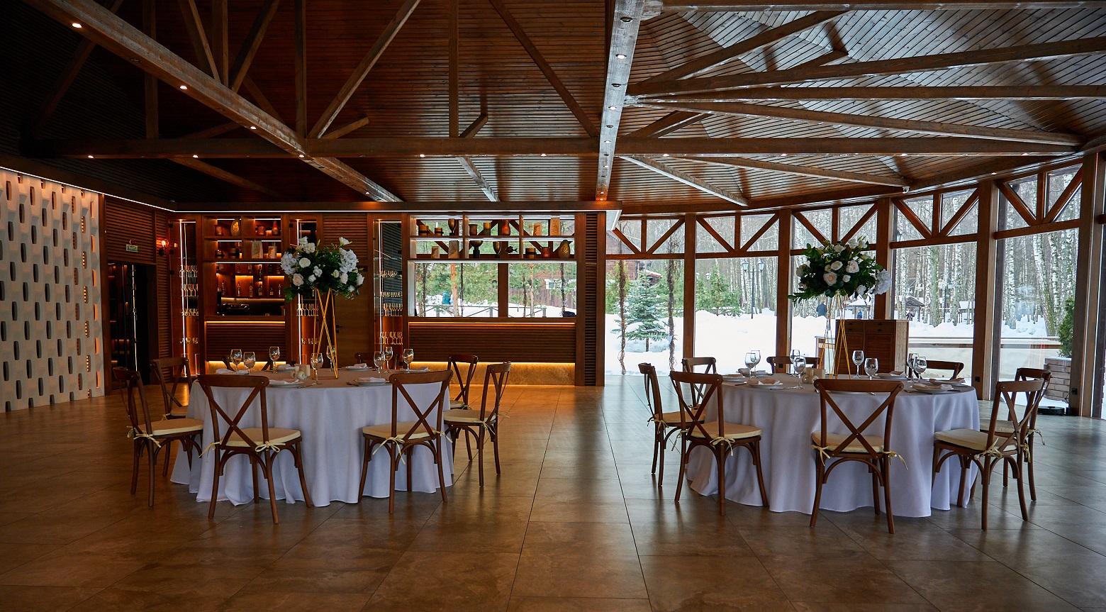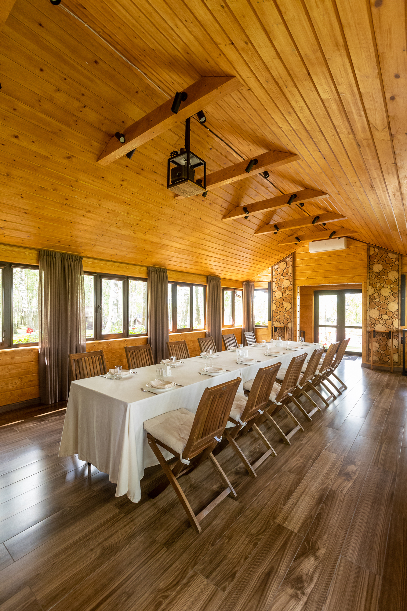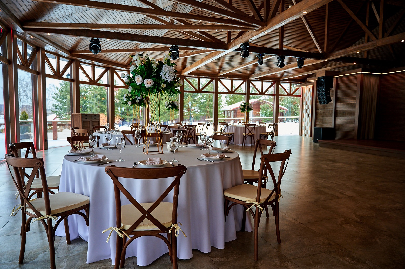 Эко-отель 4* на той же территории, что и площадки для мероприятий. Для событий, занимающих более одного дня, это прекрасная возможность продлить праздник. К услугам гостей – домики семейного формата и коттеджи на 10-12 человек, отдельный spa-центр с бассейном и русская баня. Все здания комплекса расположены в стороне от банкетных площадок и окружены пушистыми елями: мы заботимся о тишине и комфорте отдыхающих.