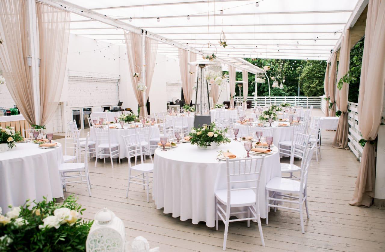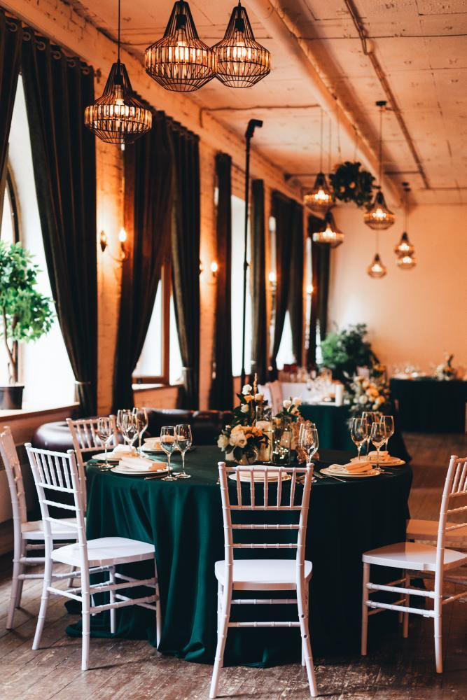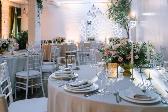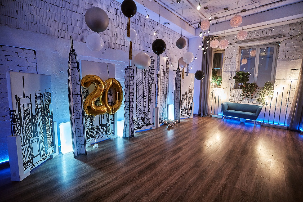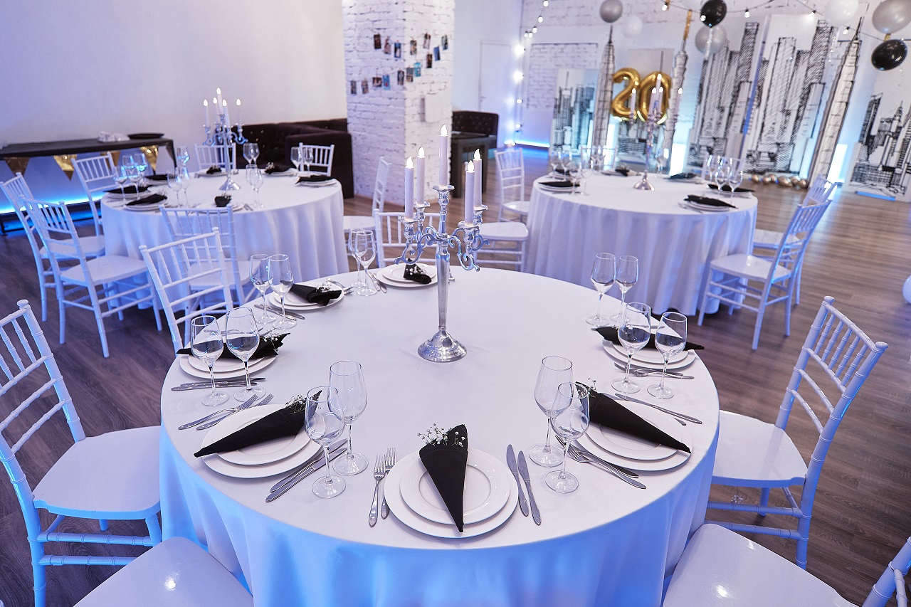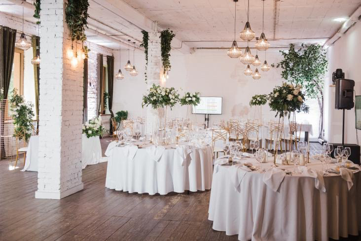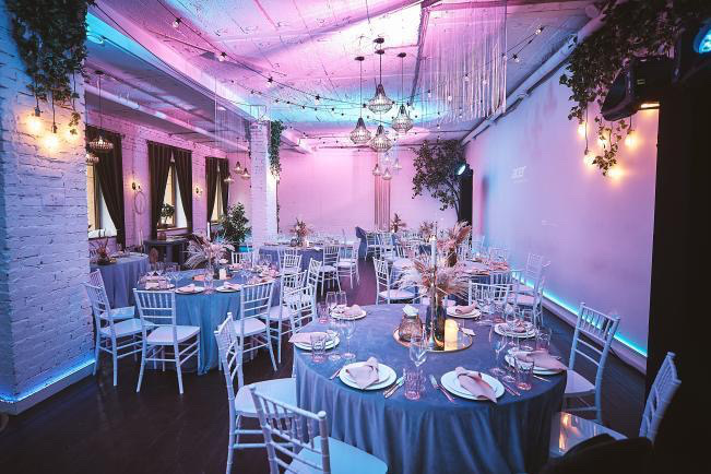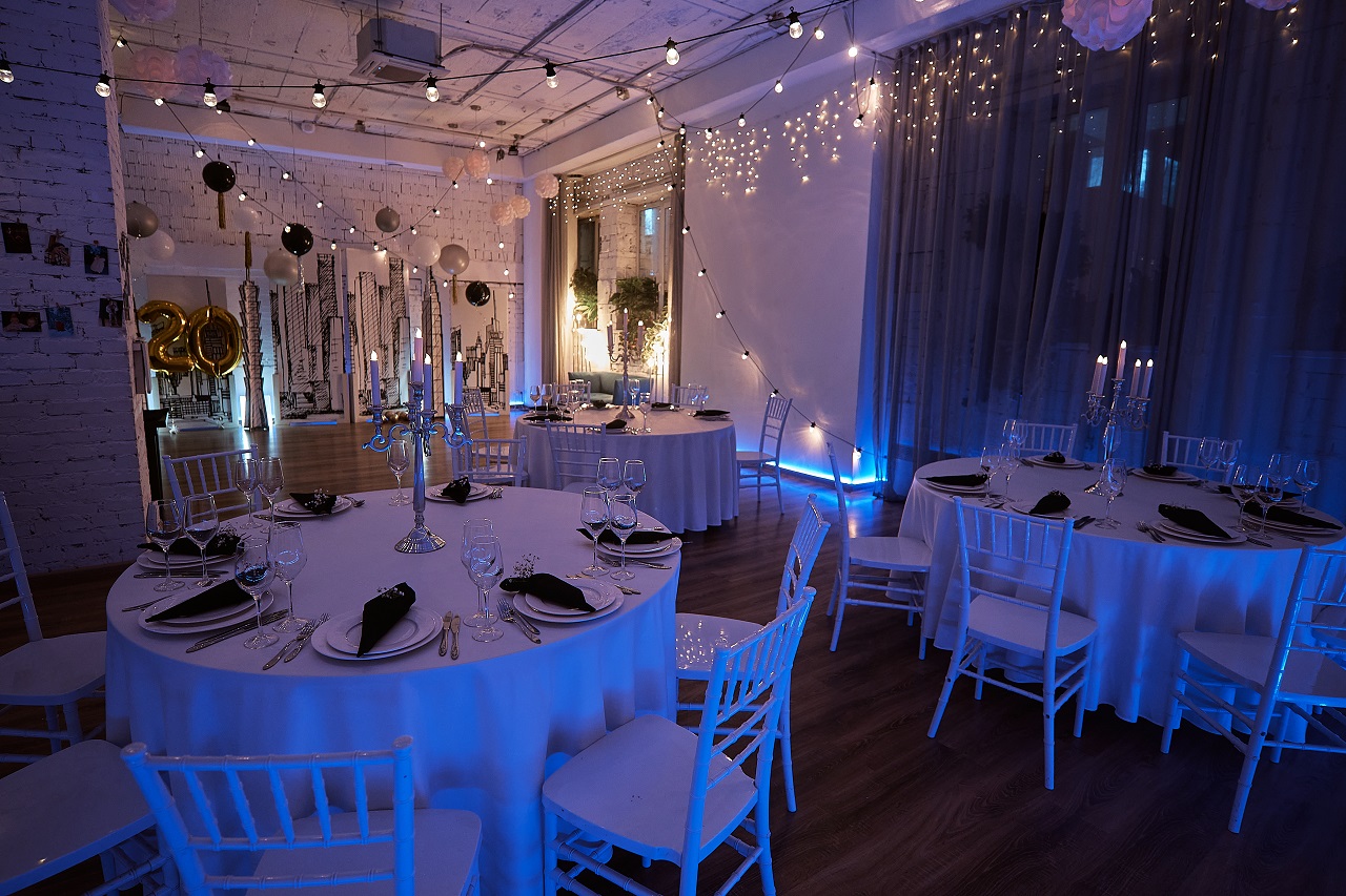 Камерный зал – самый компактный зал в нашем пространстве – 100 кв.м. Здесь такие же высокие потолки, как и в большом зале, белая кирпичная кладка, а так же подсветка по всему периметру зала, которая позволяет настроить свет и атмосферу в помещении под стиль вашего мероприятия.