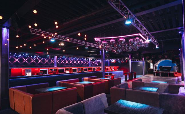 Gagarin расположился на втором этаже ТК «Миллер» на Комендантской площади. Интерьер огромного зала, с его причудливым неоновым освещением, гармонично сочетает космическую тематику и яркие детали стиля «диско». Колонны, подиумы, лестницы зонируют его таким образом, чтобы каждый пришедший нашел себе место по вкусу. Для тех, кто жаждет быть в центре внимания – большой танцпол и столики вокруг него, для тех, кто ищет общения и новых знакомств – длинная контактная барная стойка, те же, кто предпочитает уютные посиделки собственной компанией, могут расположиться на диванчиках в глубине зала или занять столик на большом подиуме над баром.