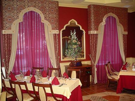 Кажется, что дух древних зодчих, рождавших жемчужины Магриба и Персеполиса, возродился, чтобы создать убранство "Мира цветов" – причудливую резьбу потолков, звездной вязью подобную лучистому своду небес, повторяющие очертания устремленных ввысь минаретов порталы окон, раскинувшие гостеприимный полог шатры, готовые принять гостя под свои своды, и в каждом - маленькое чудо рождения сказки. Она, сказка, рядом – перешагнуть порог другого зала – и вот они, герои "Тысячи и одной ночи": халифы и визири, пери и принцессы, волшебники и мудрецы приглашают отрешиться от суровой горечи будней и приникнуть к бесценным россыпям удовольствий. Окончательное превращение в эмира – в бордовом зале, где изысканность и мягкость глубокого красного фона соперничает с благородством и царственностью золотой и бронзовой отделки.