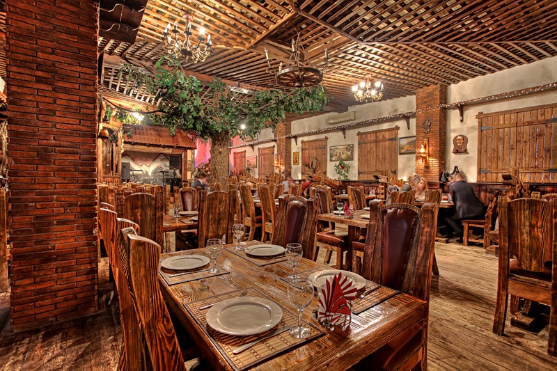 Вас приятно удивит уютный зал ресторана, он выполнен в стиле грузинского дворика, с летними верандами, винным погребом и раскидистым дубом в центре.