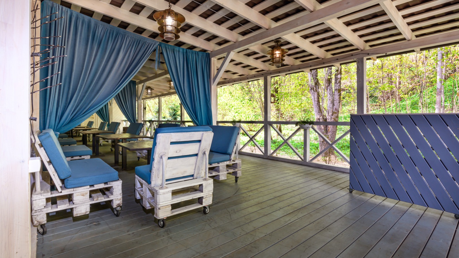В тёплое время года особенно приятно расположиться на нашей зелёной веранде: свежий воздух, удобная мебель, фонарики по вечерам и вид на лесопарк создают атмосферу лёгкости и отдыха.