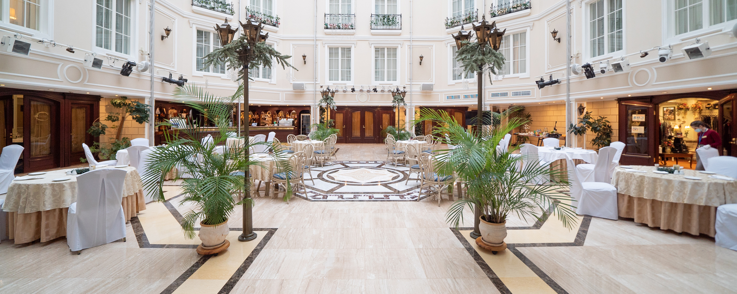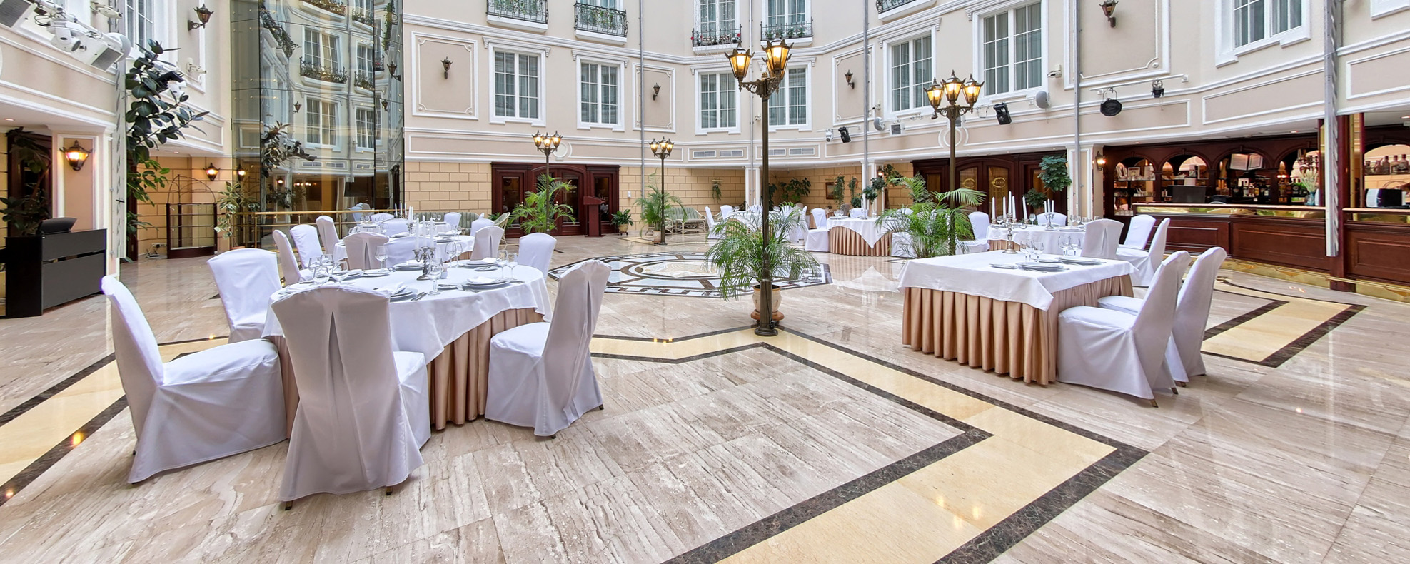 Внутренний дворик отеля с прозрачным стеклянным куполом крыши, большим количеством живых растений, выдержанным в тёплых тонах интерьером. Окна жилых номеров выходят в этот зал, поэтому у этой площадки есть временные и шумовые ограничения: мероприятие длится до 22:00.