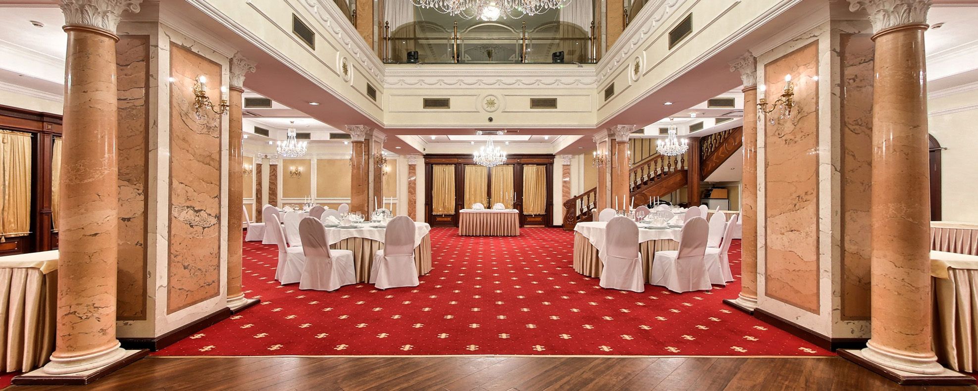 Этот просторный зал идеально подойдет для пышных свадеб с большим количеством участников. Инфраструктура зала включает в себя профессиональную сцену, гримерную комнату, световое и звуковое оборудование. Мрамор и хрусталь – сочетание, которое не оставит равнодушным людей, ценящих королевскую роскошь и выдержанный стиль.
