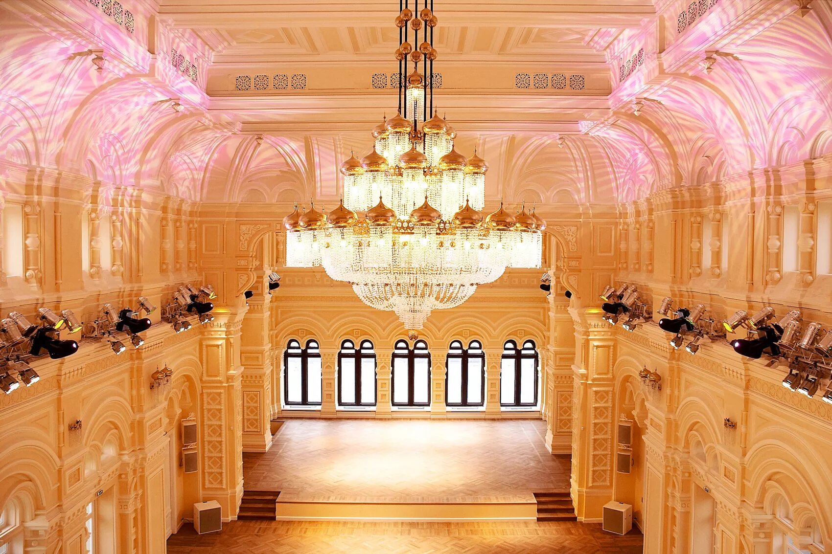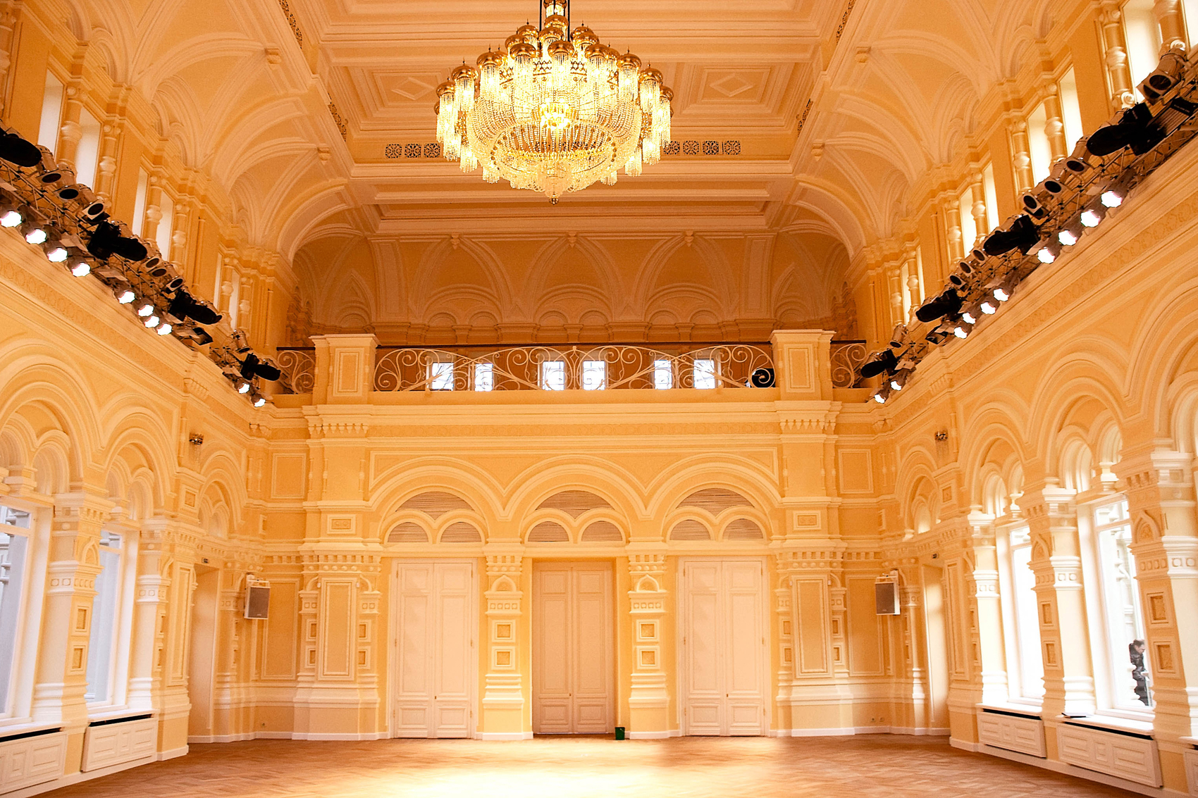 Общая площадь зала – 386 м2. Стационарная сцена – 10х10 м. Зал оборудован десятью акустическими системами, световым оборудованием для создания спецэффектов и заливного света, видеооборудованием, радиоуправляемым проекционным экраном.