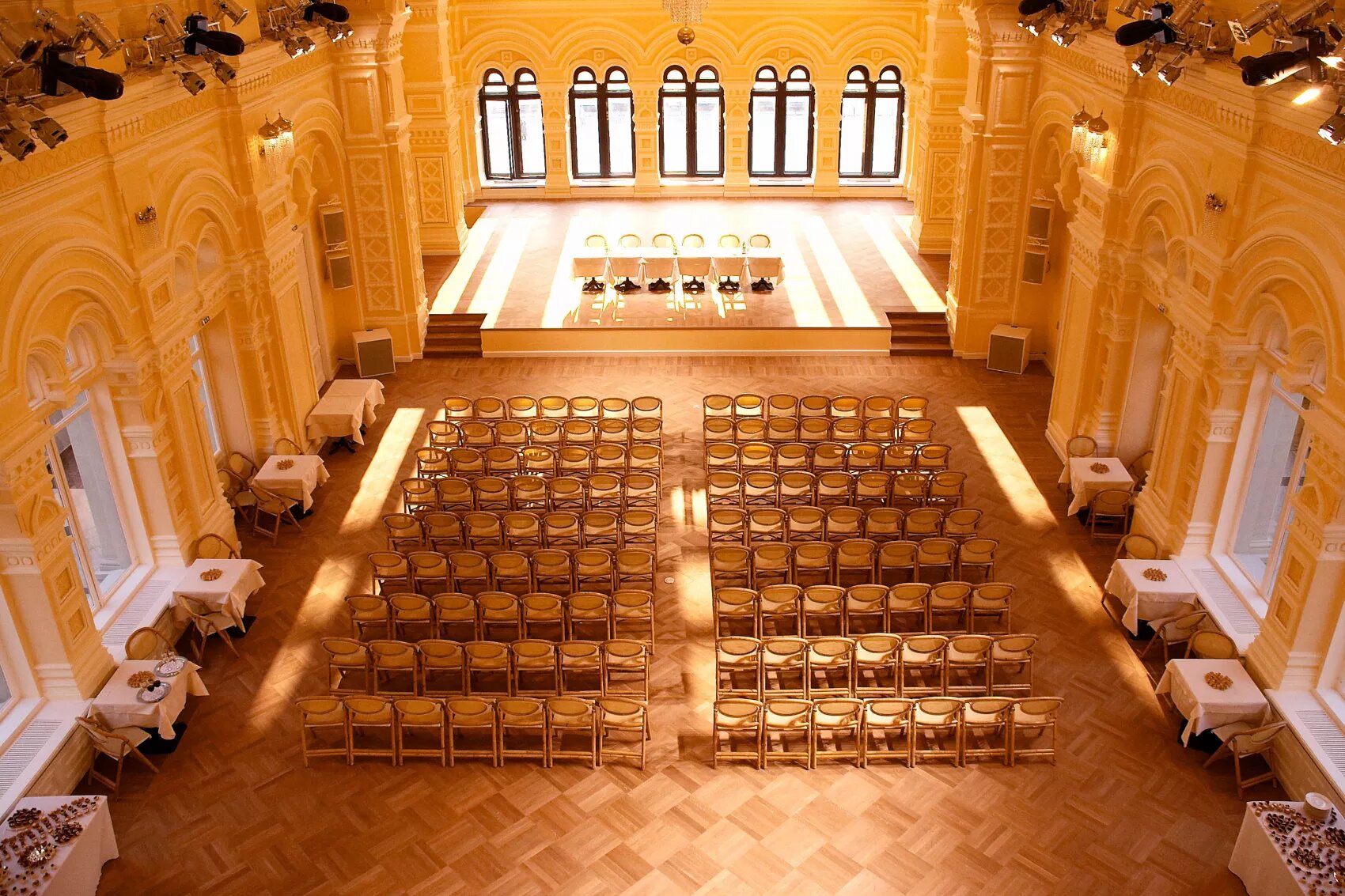 Это единственный в мире зал торжеств, позволяющий любоваться великолепной панорамой Красной площади. К расположенному на третьем этаже залу со стороны Красной площади ведет парадная лестница, выполненная из красного карельского гранита.