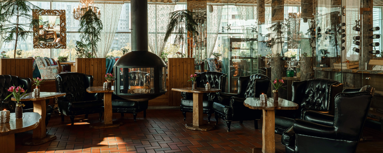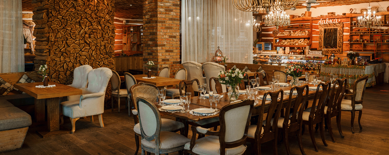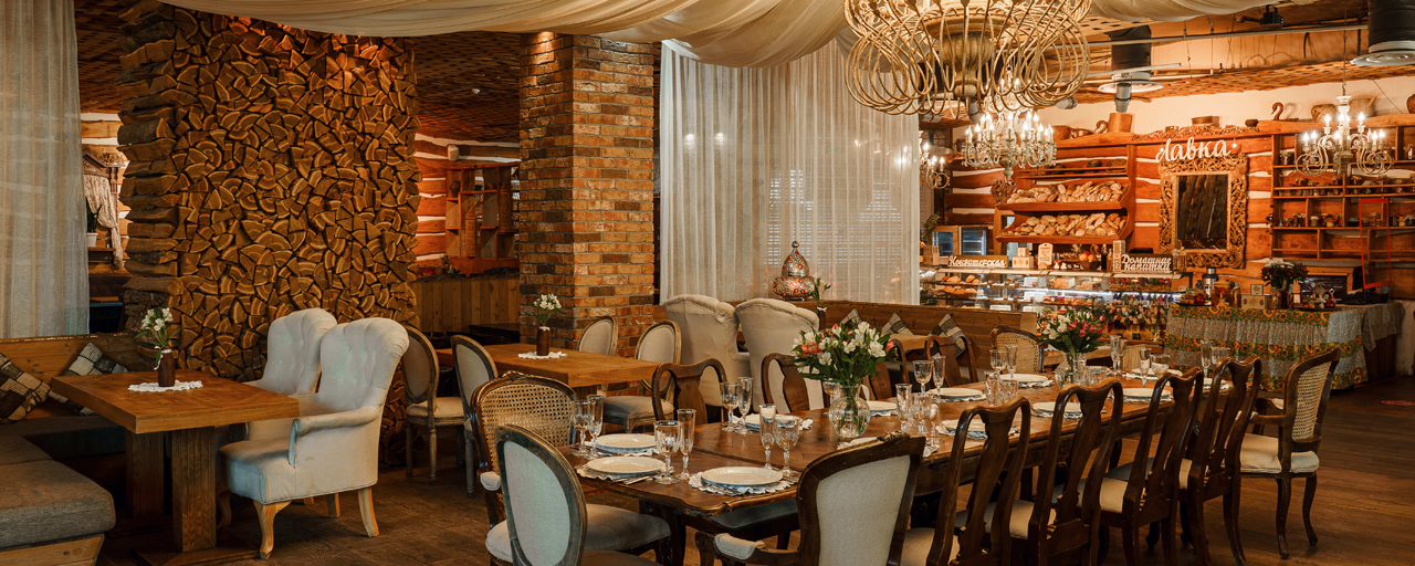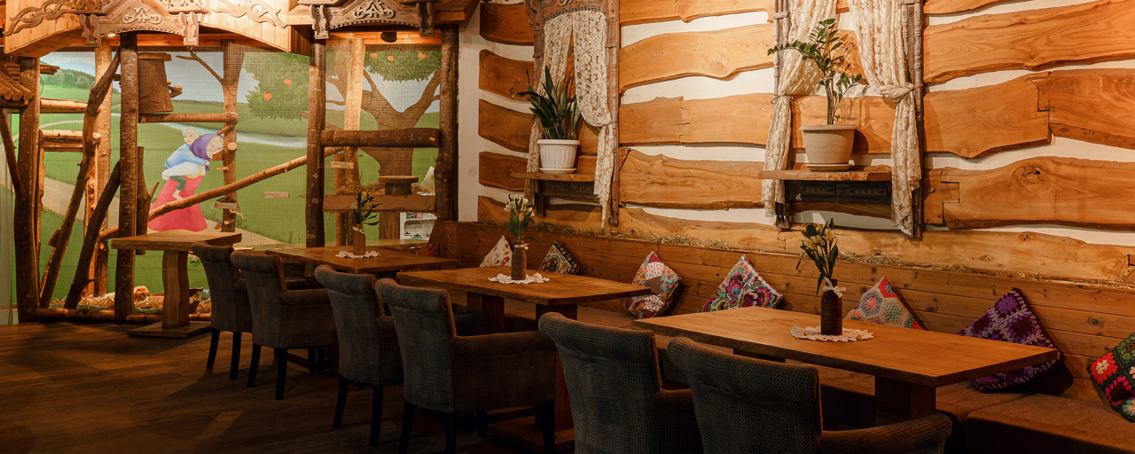 Интерьер и меню в духе русских сказок: бревенчатые стены, щучья уха, старинная утварь, рыба из коптильни, русская печь и панорамный вид на город.