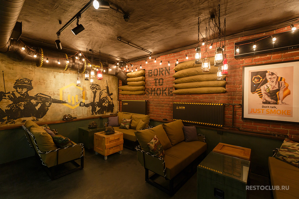 Интерьер кальянной крайне аутентичен. Парашютные стропы, армейские подушки, ящики и сейфы-столешницы, диваны-койки — стиль выдержан в цветах милитари. По стенам развешено оружие — можно сфотографироваться и повертеть в руках настоящую винтовку. Военное снаряжение задействовано везде — кальянное меню оформлено в виде гранаты, а бронь столика обозначают настоящей армейской каской.