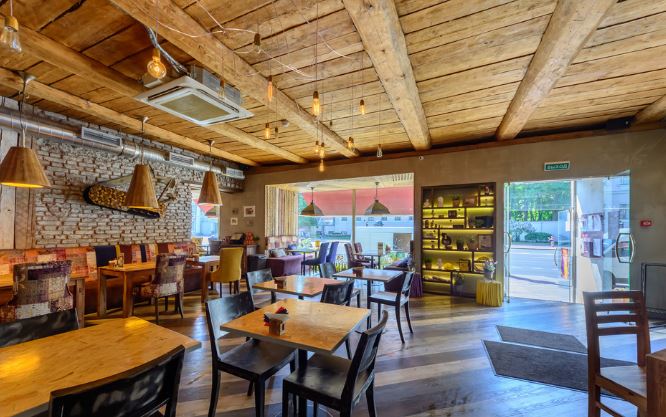Интерьер гастропаба«Иван даМарья»—это сочетание скандинавского ирусского стилей. Акцент воформлении сделан нанатуральные материалы. Преобладает деревянная отделка всочетании состаринной кирпичной кладкой здания XIX века.
