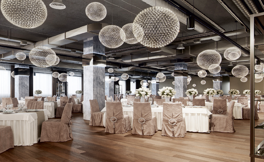Современное дизайнерское решение, мягкое освещение, элегантная мебель создают ощущение уюта и комфорта. Интерьер выполнен в стальных, ореховых и оливковых тонах. Стиль можно охарактеризовать как современное американское арт – деко.Просторный современный банкетный зал площадью 600 кв.м. Наши преимущества – наличие отдельного входа, стильная просторная зонаwelcome, наличие собственной парковки и шаговая доступность отметроБауманская. Интерьер выполнен в светлых тонах.