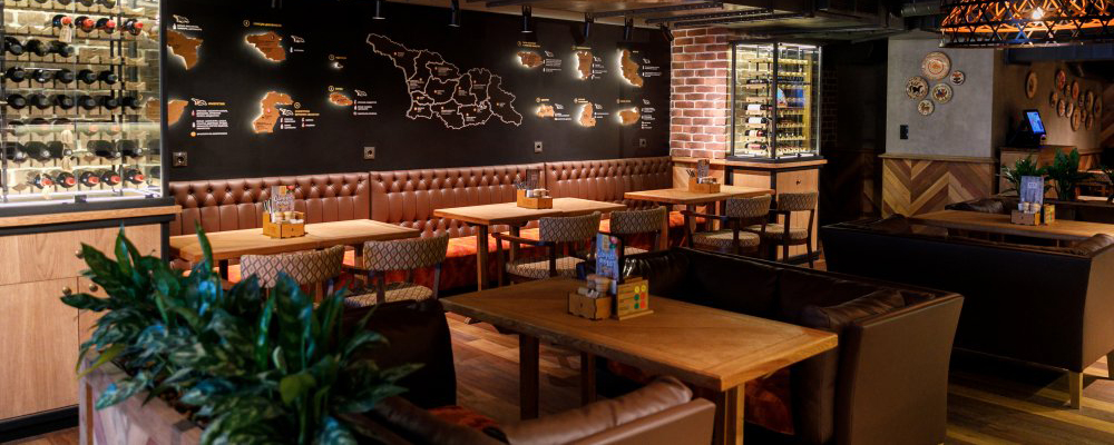 В зале с открытой кухней витают запахи хачапури от дровяной печи и тандыра. Во втором зале можно изучать географию грузинских вин – карта на стене рассказывает о винах различных регионов Грузии.