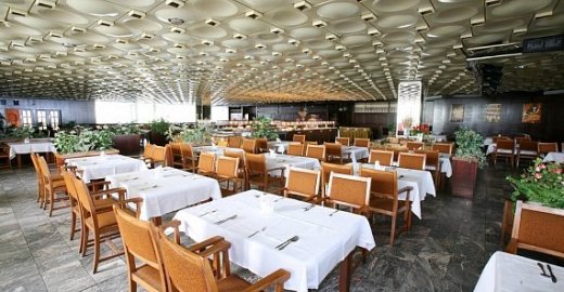 Ресторан «Хрустальный»— это огромный зал спанорамными окнами, который может скомфортом принять большое количество людей, что очень удобно дляпроведения масштабных мероприятий. Вменю ресторана представлены холодные закуски, горячие блюда, свежая выпечка инапитки. Для туристов организовано трехразовое питание и«шведский стол». Банкетные залы ресторана можно легко использовать длясимпозиумов, ярмарок, конференций иконцертов, благодаря всевозможным вариантам расстановки столов икресел, разнообразным банкетным меню ивеликолепному сервису.