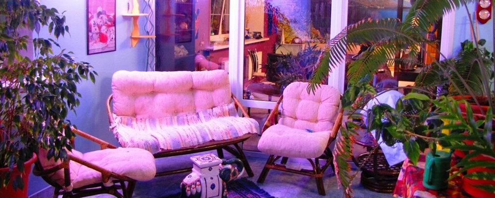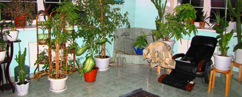 – оранжерея с тропическими растениями, аквариумом, зелёной горкой с фонтаном, поющими канарейками и симпатичным попугаем. Здесь же массажное кресло, чтобы расслабиться после СПА.