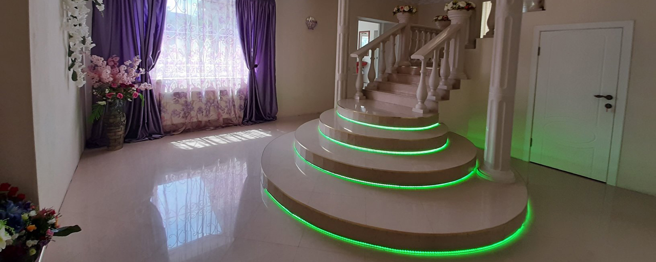 - Оформление интерьера в дворцовом стиле – с мрамором, позолотой, колоннами, хрустальными люстрами и бра, высокими потолками с лепниной, стенами с линкрустой и камином, отделанным натуральным мрамором.