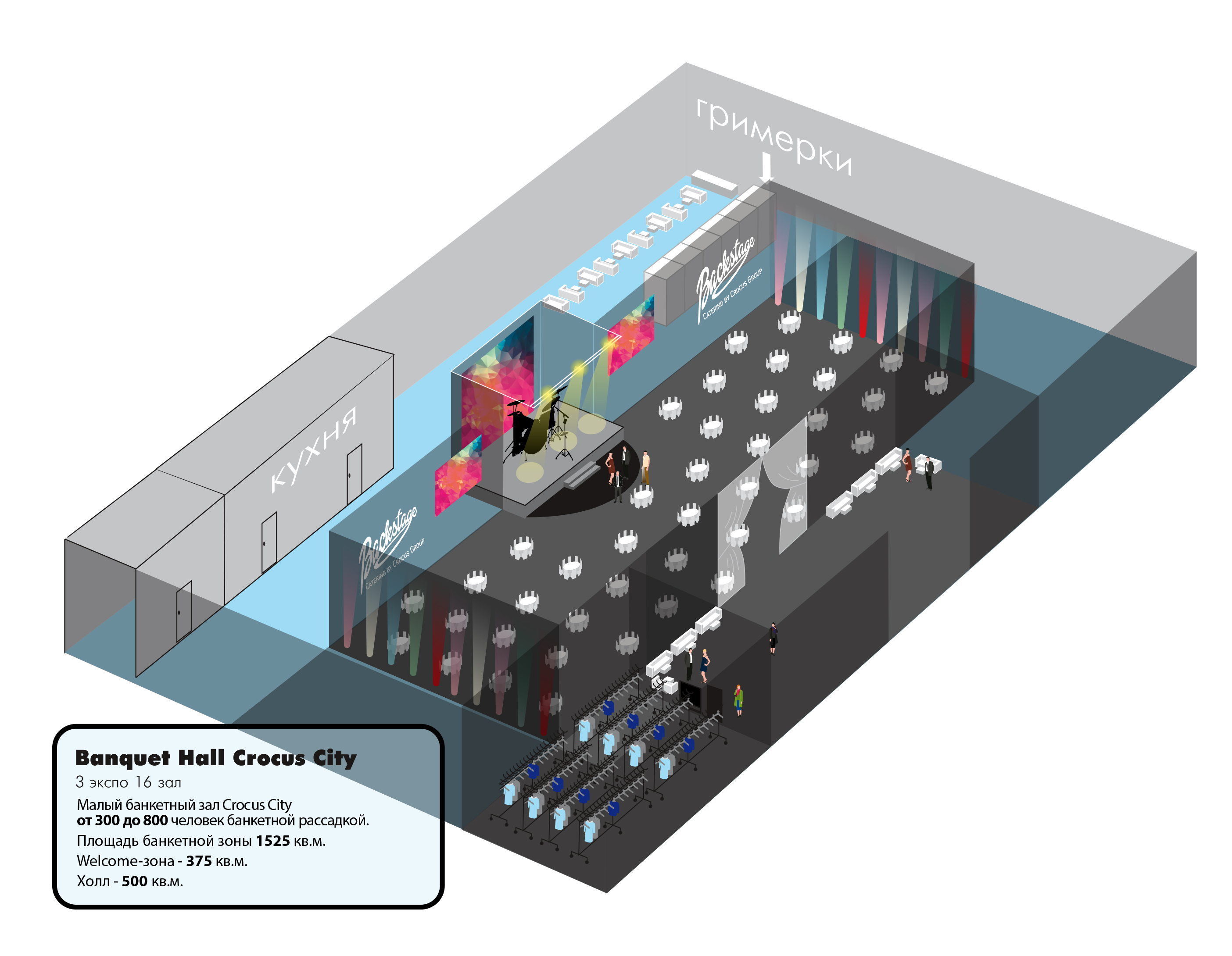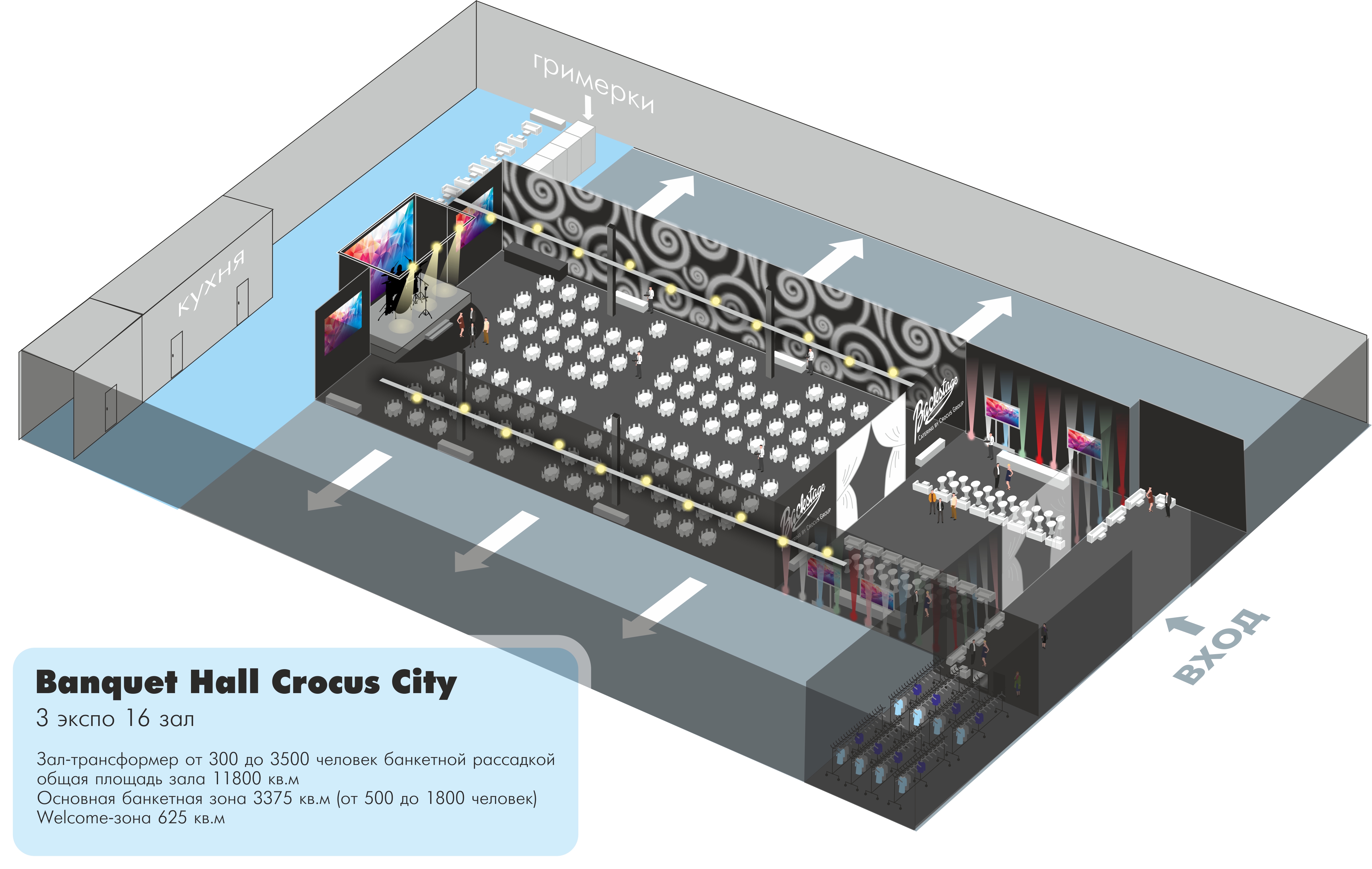 Crocus Banquet Hall способен комфортно разместить от 100 до 3500 человек. Возможность зонирования пространства, увеличения или уменьшения позволяет создать уютную атмосферу на любое количество Ваших гостей. Общая площадь зала - 11 800м2, Welcome зона оборудованная барной стойкой - 500м2, , Lounge зона с диванными группами и коктейльными столиками. Три основные банкетные зоны: 800 кв м (до 400 человек банкетом), 1500 кв м (до 800 человек), 6 000 кв м (до 3500 человек банкетной рассадкой).