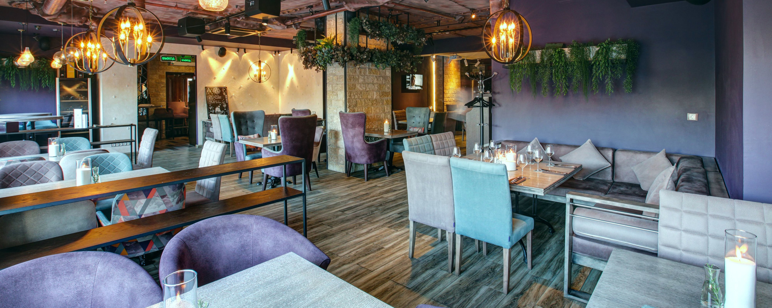 Посетителей принимают в просторном светлом зале с колоннами и панорамными окнами во всю стену. Интерьер классический, при этом по-домашнему уютный: мягкие кресла, диваны с подушками, много зелени и декора, живописный камин, вмонтированный прямо в барную стойку. В случае необходимости помещение можно зонировать при помощи ширмы.