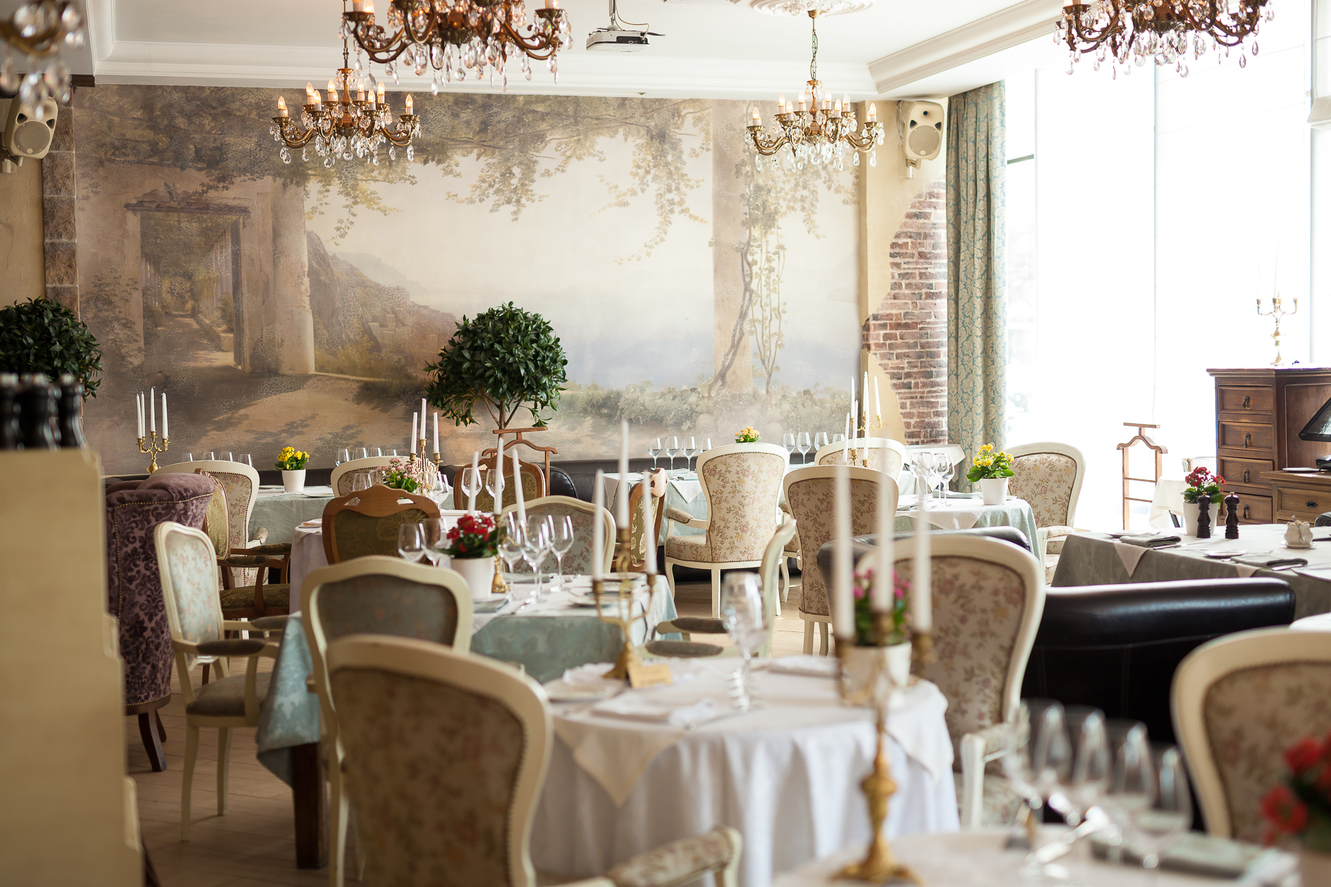 Декор ресторана, выполнен в теплых, пастельных тонах, сочетает изысканность и простоту, изящество и домашний уют, что позволяет проводить в нашем итальянском ресторане и праздничные банкеты, и незабываемые вечера в кругу близких людей.