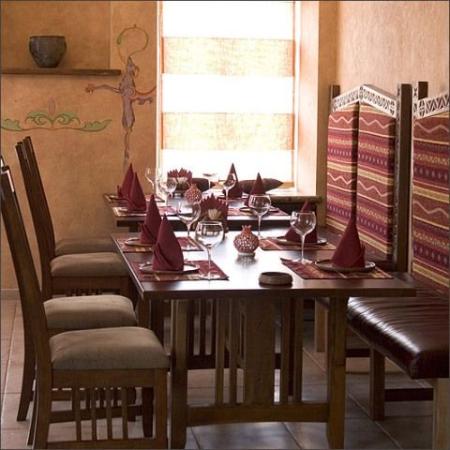 Интерьер - с традиционным уклоном. Посуда - глиняная с ручной росписью.