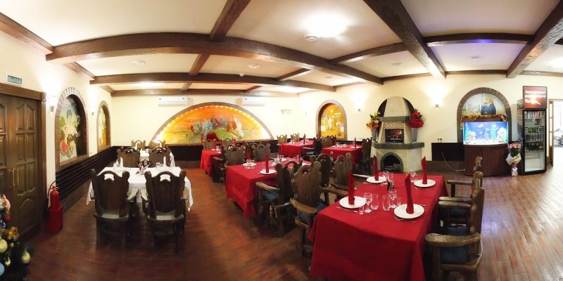 Стол и интерьер, честно говоря, не поразили воображение, но этого и не требовалось. Какой интерьер сравнится со столетними деревьями, белым снегом на тропинках и мерным поскрипыванием дубов под неторопливым зимним ветром.