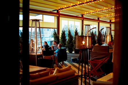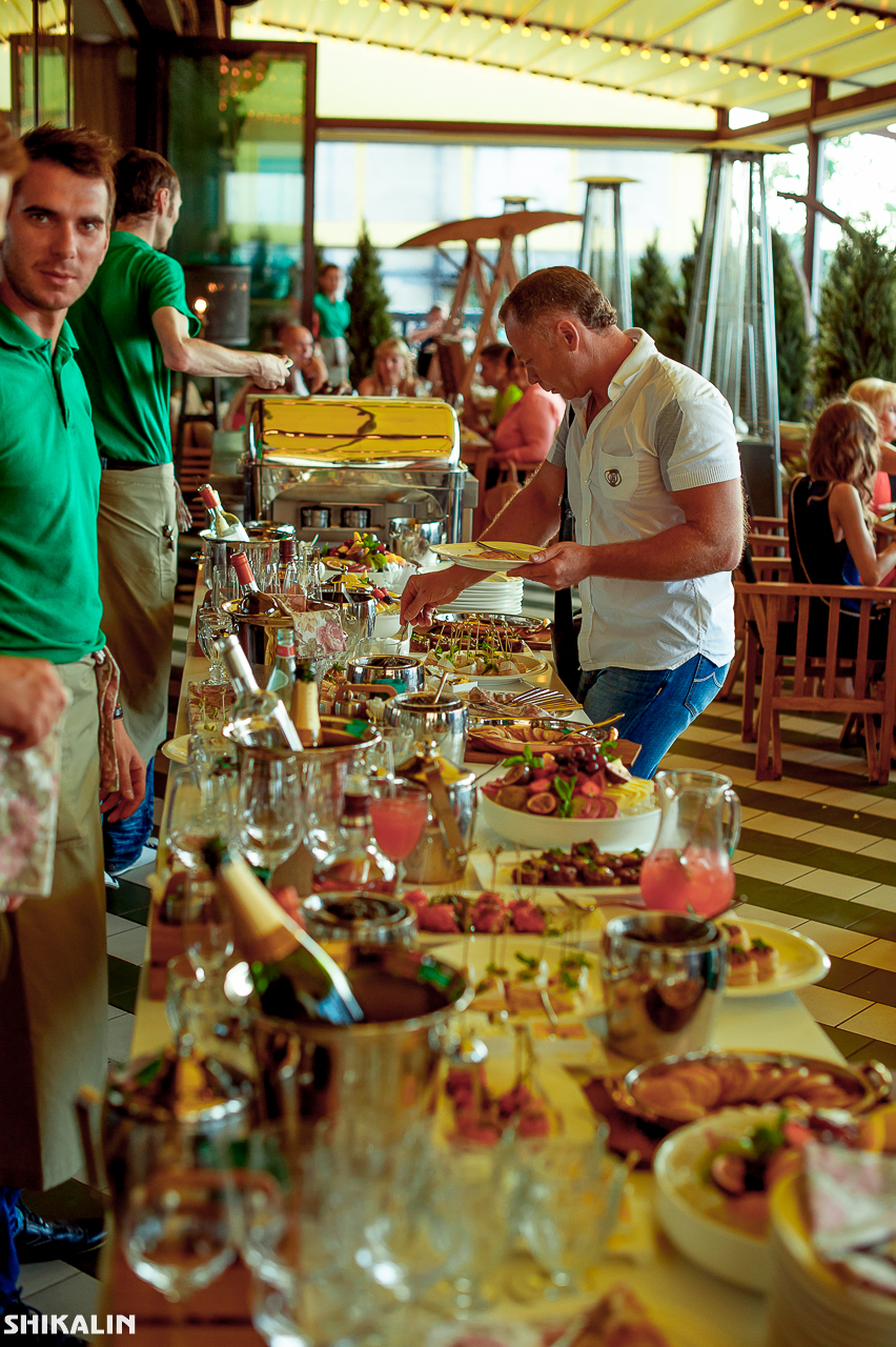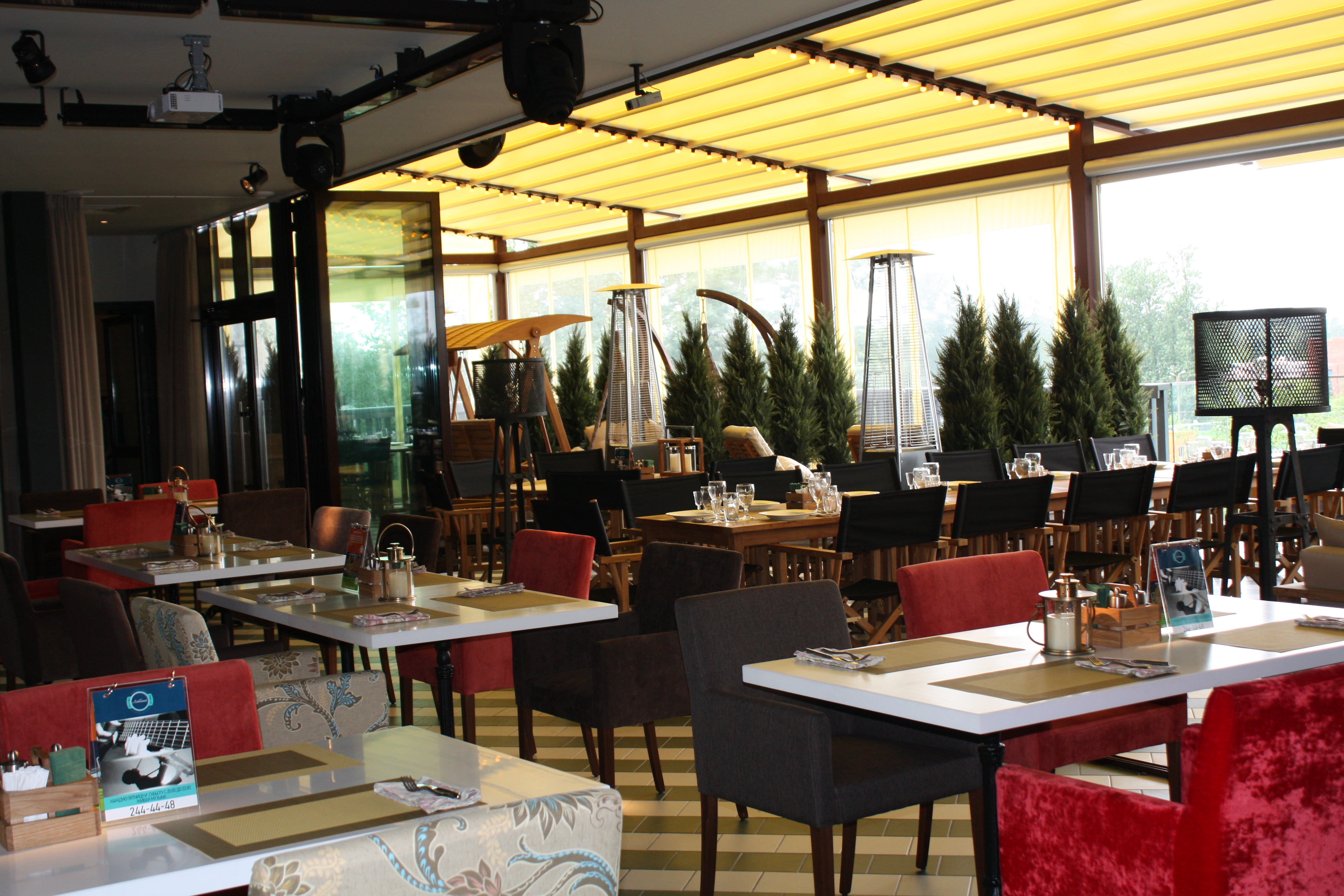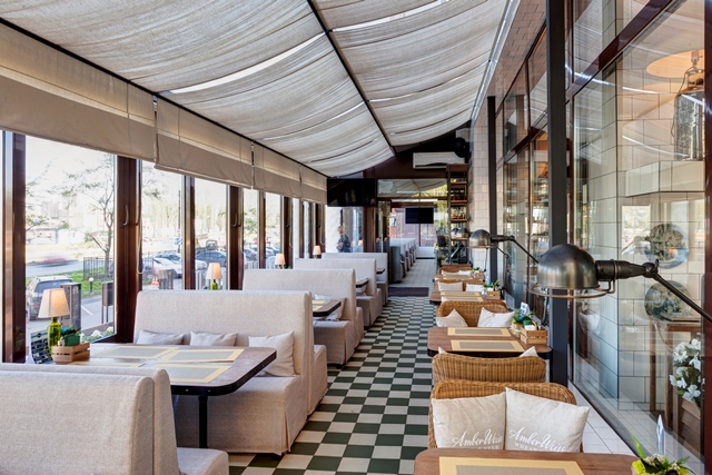 Банкетный зал и открытая летняя терраса с трансформирующейся крышей, где под открытым небом готовят мясо на вертеле, a гостям предлагают самостоятельно приготовить блюдо на раскаленных камнях.