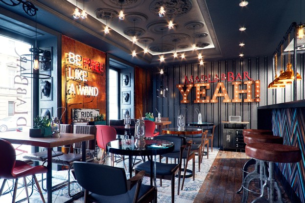 Пространство MadLabBar гармонично разделено на три логических зоны: зал с открытой кухней, функциональный лаунж с диванами и удобными столами и контактный бар с танцполом. Кроме того, в благоприятную погоду у гостей есть возможность расположиться за столиками во внутреннем дворе. Над интерьером работало архитектурное бюро Studia-54: исключительно продуманная и стильная эклектика отражает концепцию заведения. Нетривиальные сочетания нео-классики с авангардом, античных мотивов с ультра-современными получили воплощение буквально в каждой детали: уникальные столы сочетают медные элементы с лепниной, дизайнерские светильники гармонично соседствуют с античными бюстами.