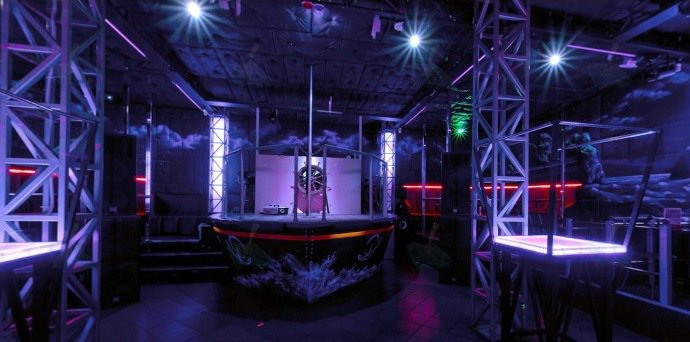 Интерьер ресторана способствует тому, чтобы здесь расслабиться и отдаться воле желаний в веселых развлечениях — мягкие кожаные диваны, просторные площадки для танцев, зеркала, светомузыка.