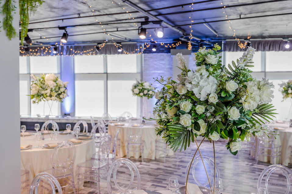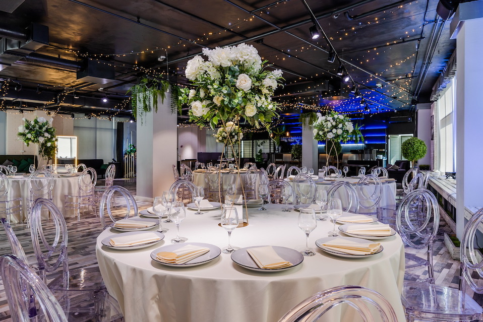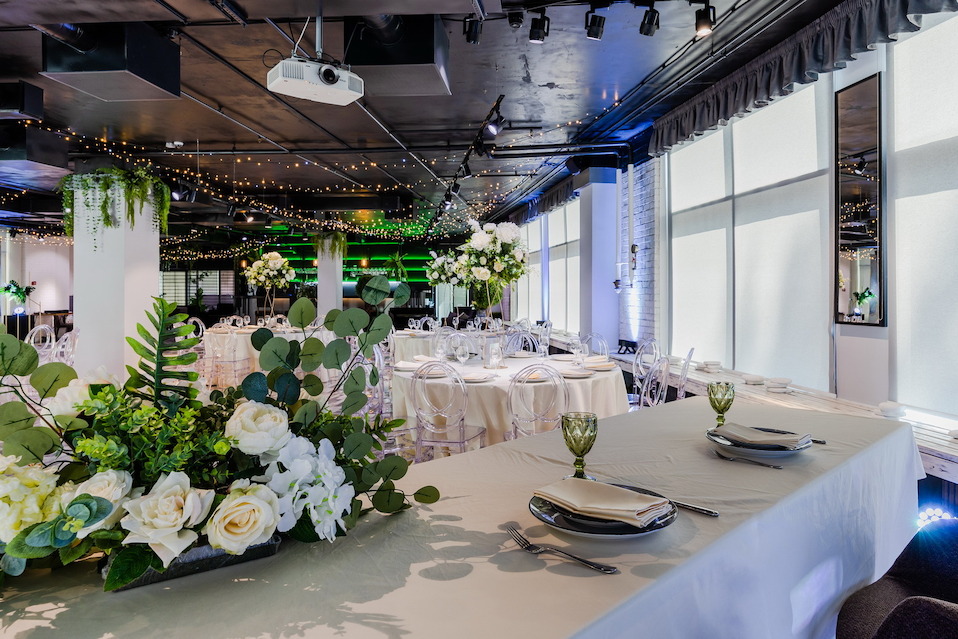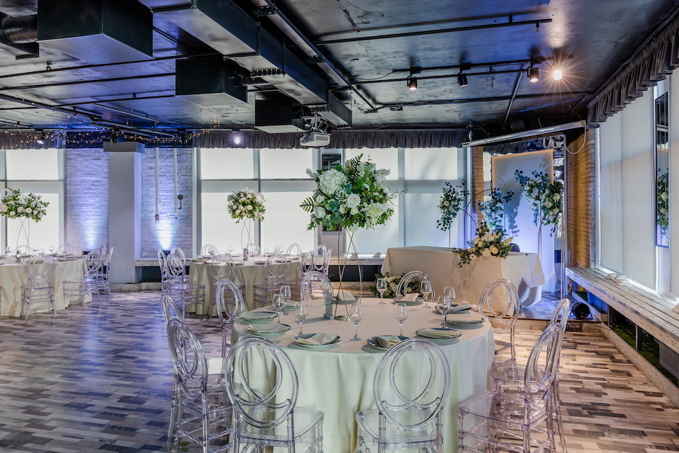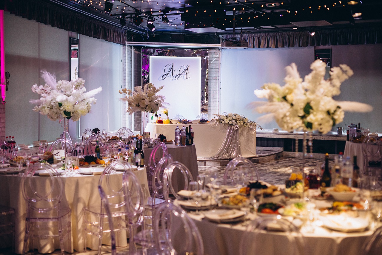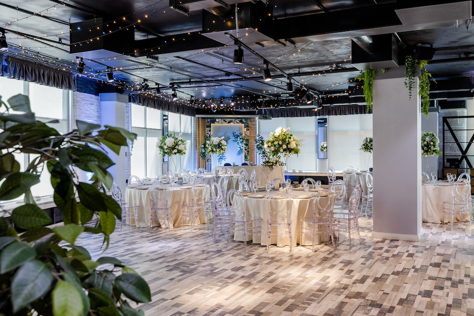 Празднуем без ограничений по звуку: веселиться и отмечать разрешаем после 23:00, а еще можно целиком арендовать зал, где есть танцпол со светомузыкой, комфортный гардероб и аккуратный подиум. На нем могут расположиться молодожены, а за остальными столами — порядка 150 гостей.