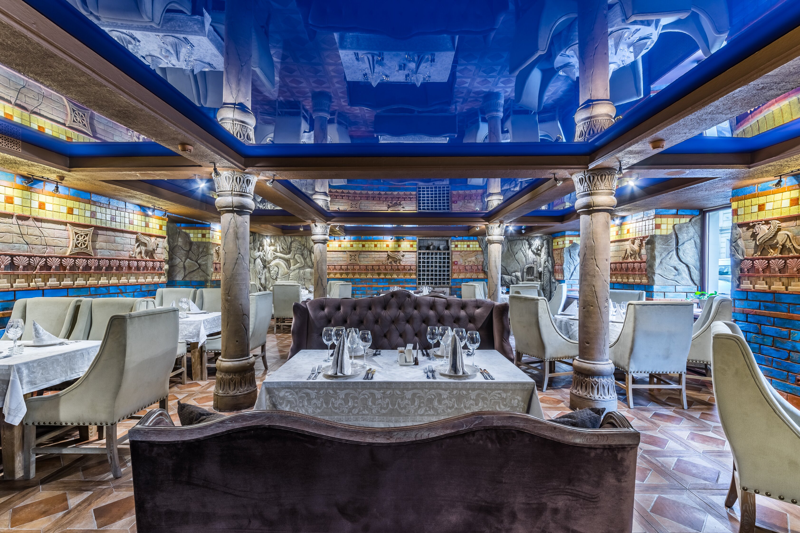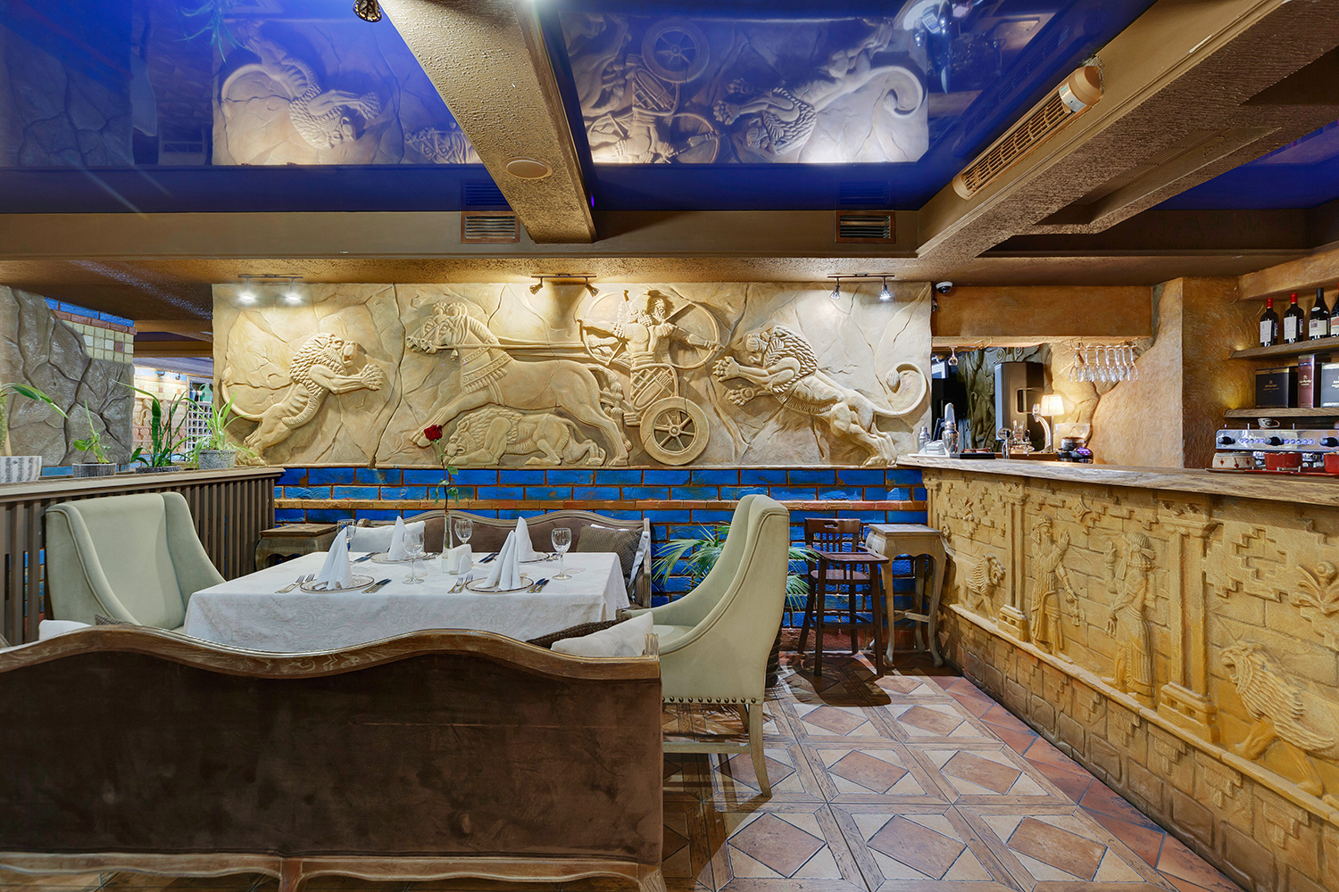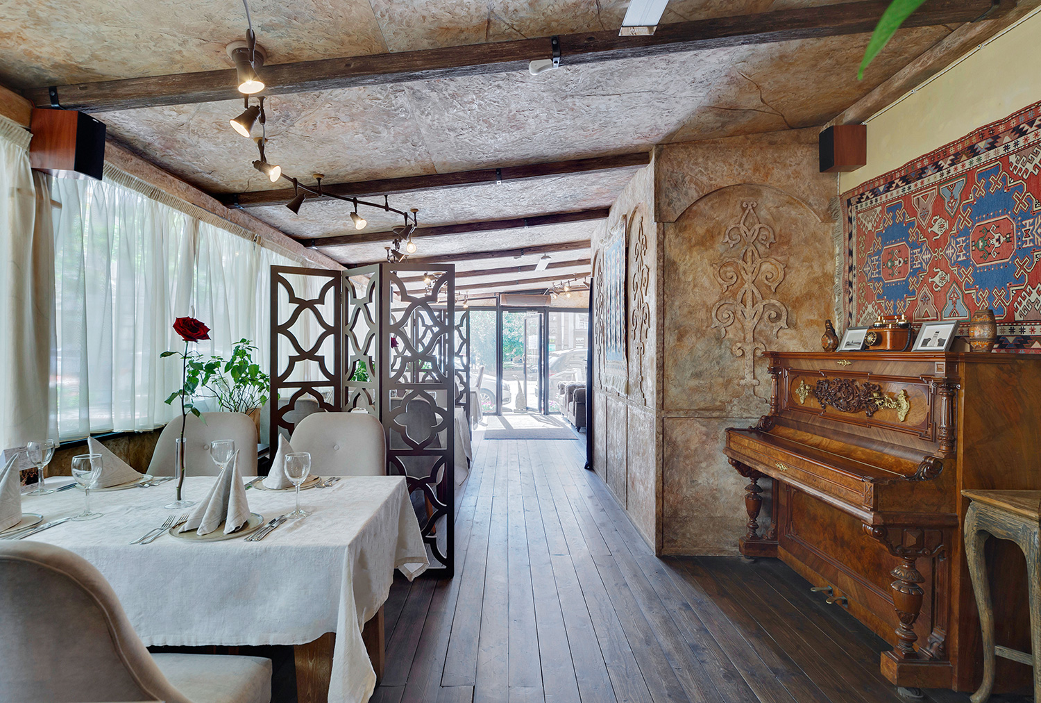 Интерьер ресторана полностью олицетворяет культуру Армении. На стенах - точная копия барельефов крепости Эребуни (Ереван). Уютную атмосферу создают мягкие диваны, эксклюзивные скатерти, посуда ручной работы и обивка мебели из бархатной ткани традиционного армянского цвета. Ресторан состоит из двух залов: основной и малый (с баром, открытой кухней и лавкой армянских продуктов), а также уютной всесезонной террасы с большими окнами, цветами и атрибутами древней Армении.