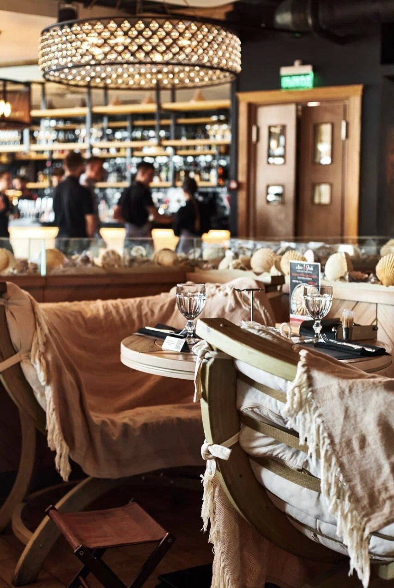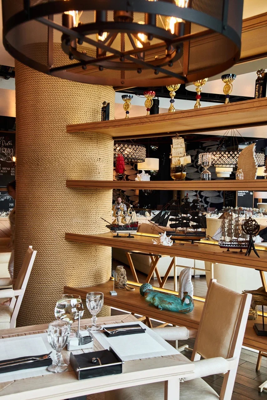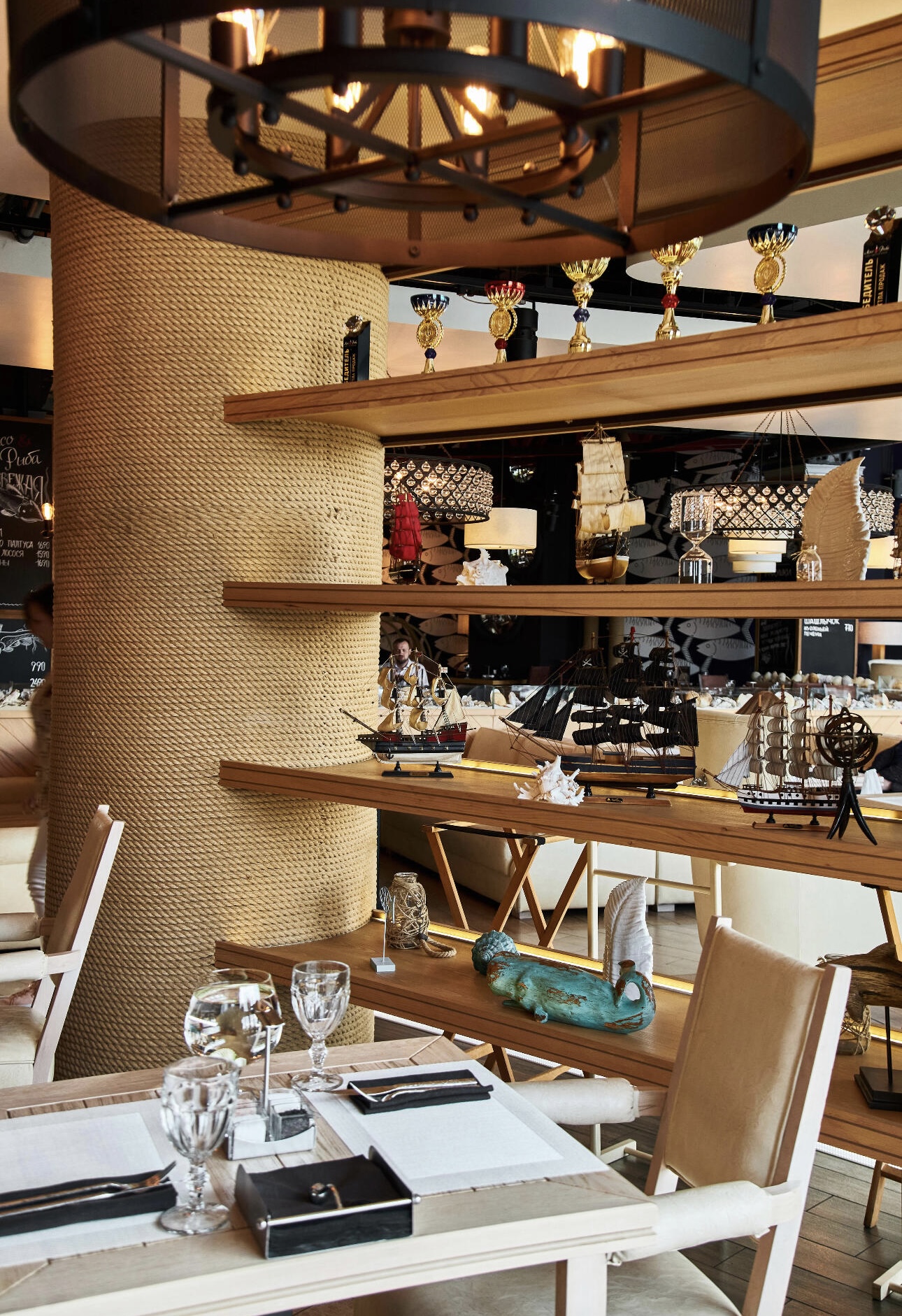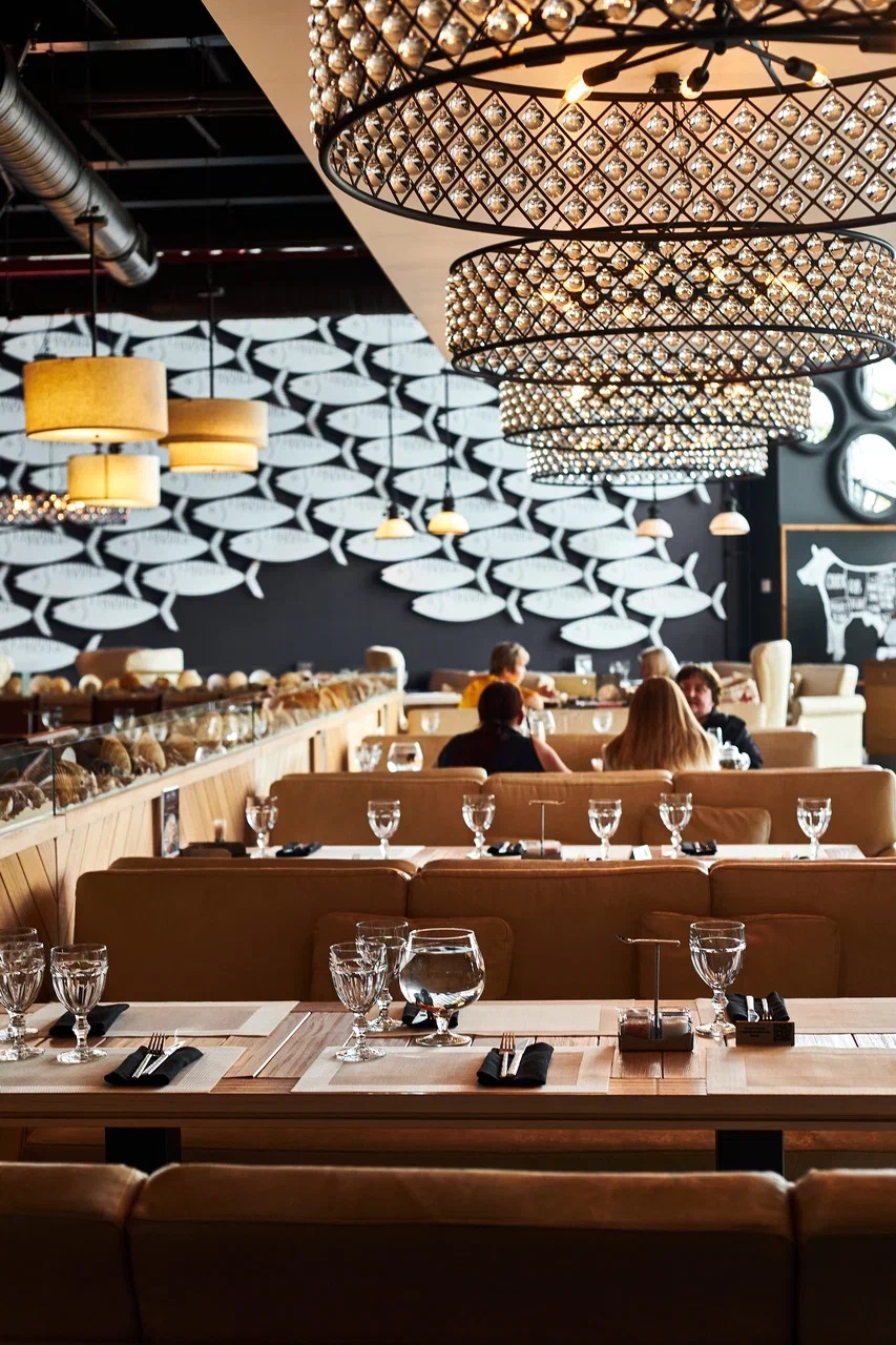 Концепция отражена и в интерьерах: территория заведений поделена на две примерно равные по площади зоны – «мясную», выполненную в темных тонах, закрытую и разделенную на приватные уголки, и «рыбную», открытую, светлую, прозрачную для посторонних взглядов.