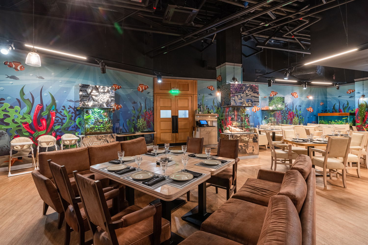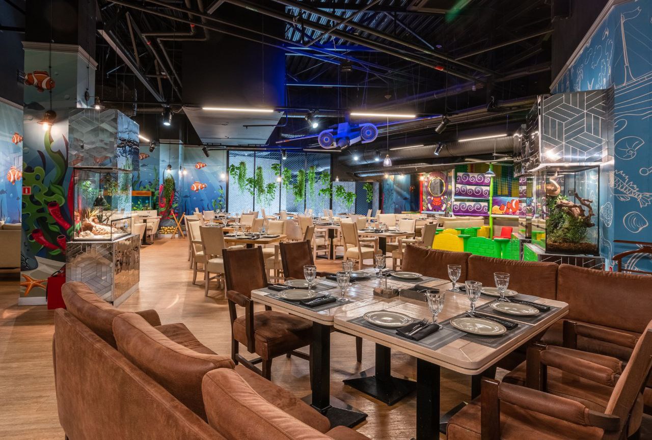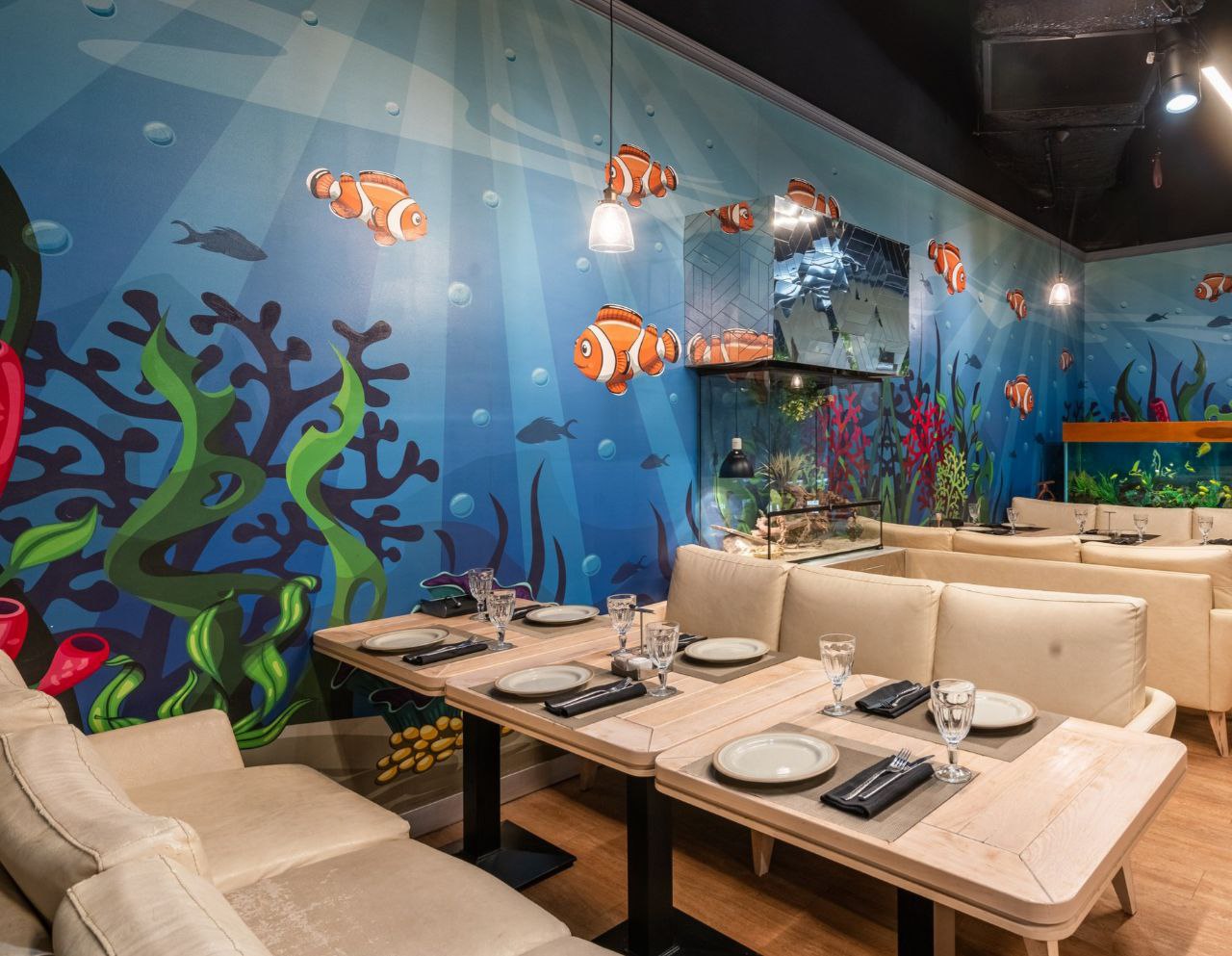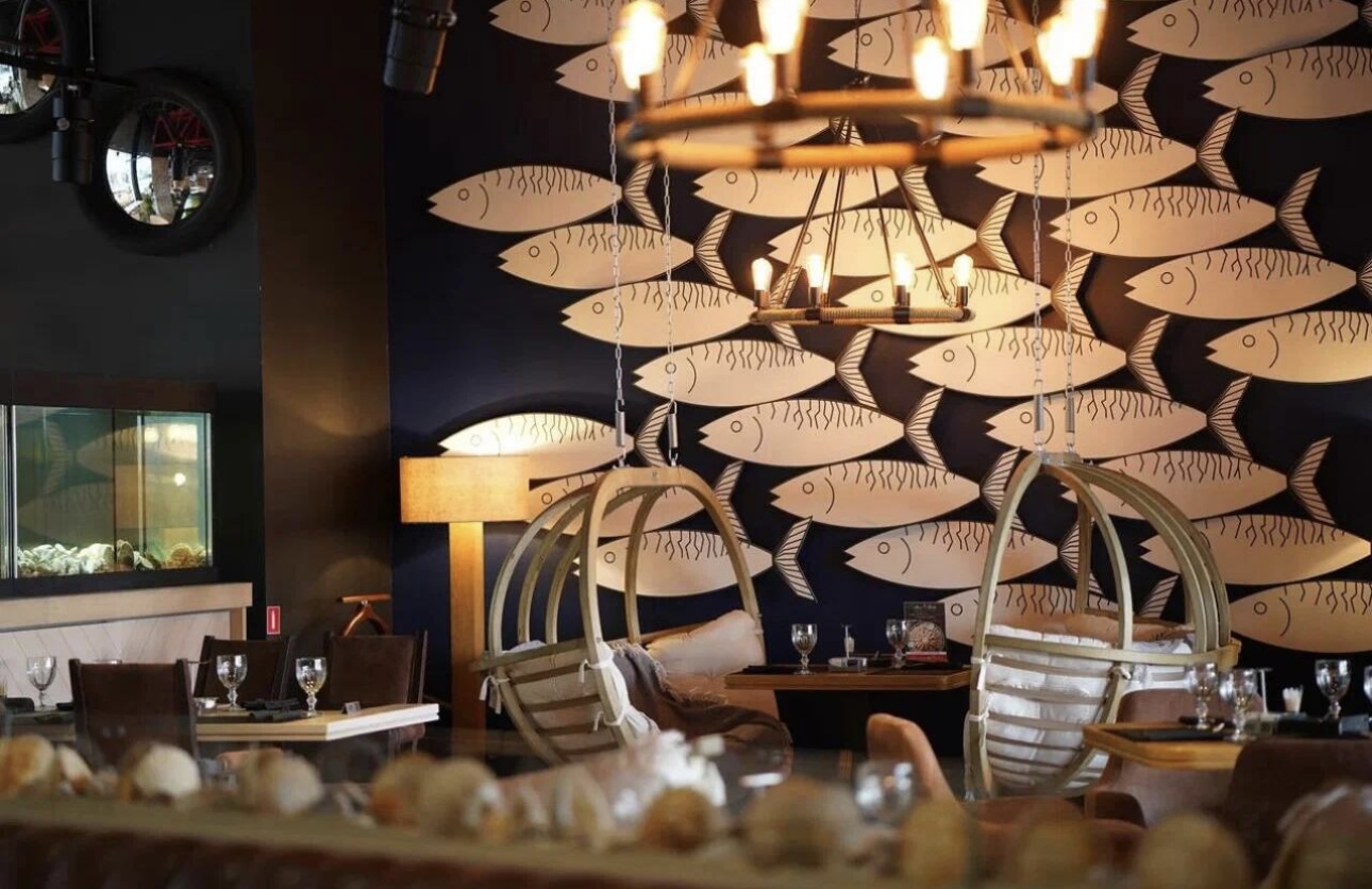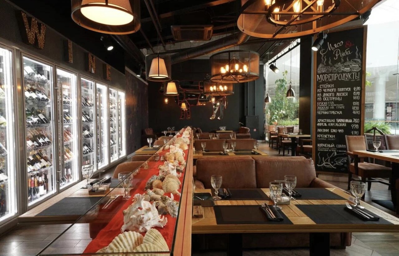 Концепция отражена и в интерьерах: территория заведений поделена на две примерно равные по площади зоны – «мясную», выполненную в темных тонах, закрытую и разделенную на приватные уголки, и «рыбную», открытую, светлую, прозрачную для посторонних взглядов.