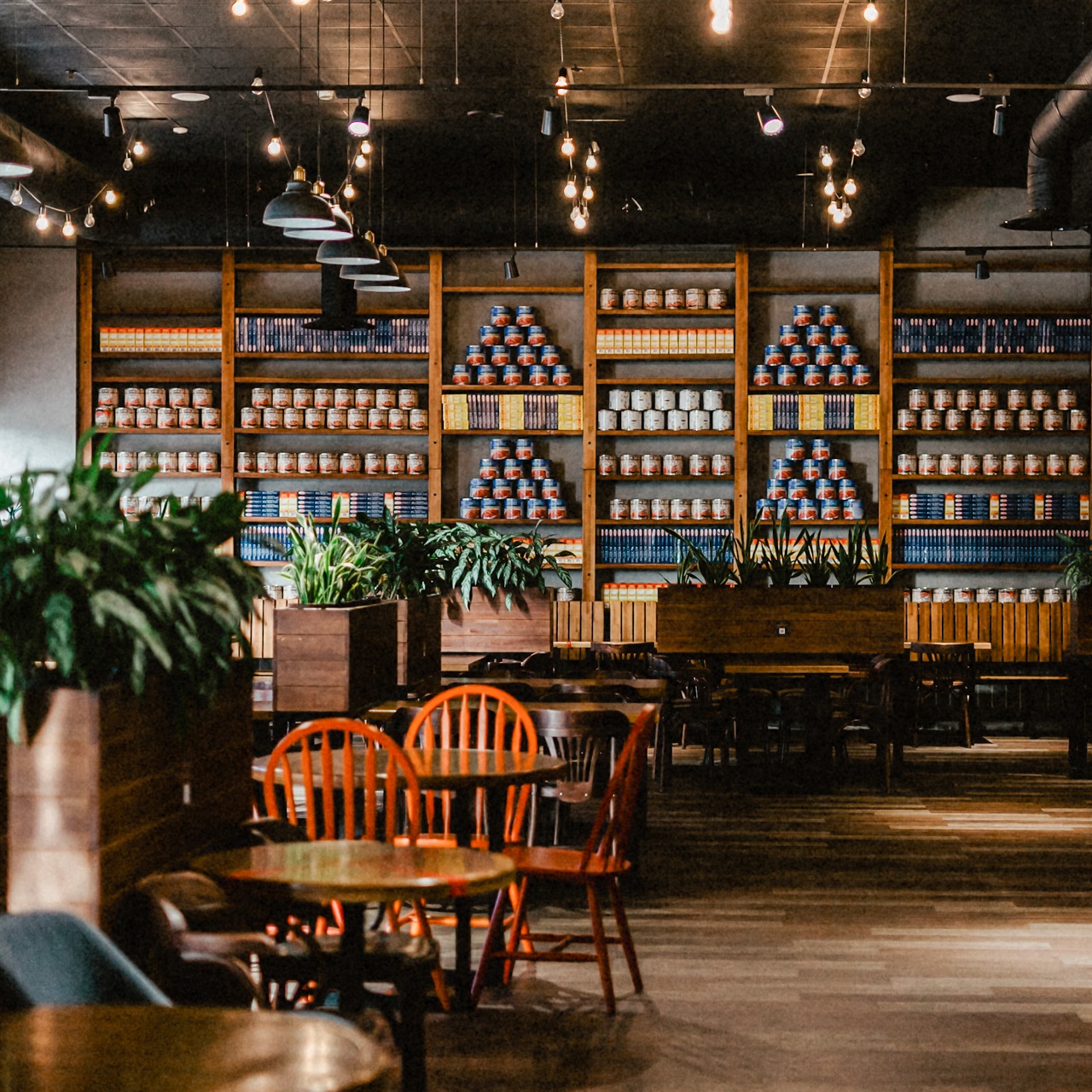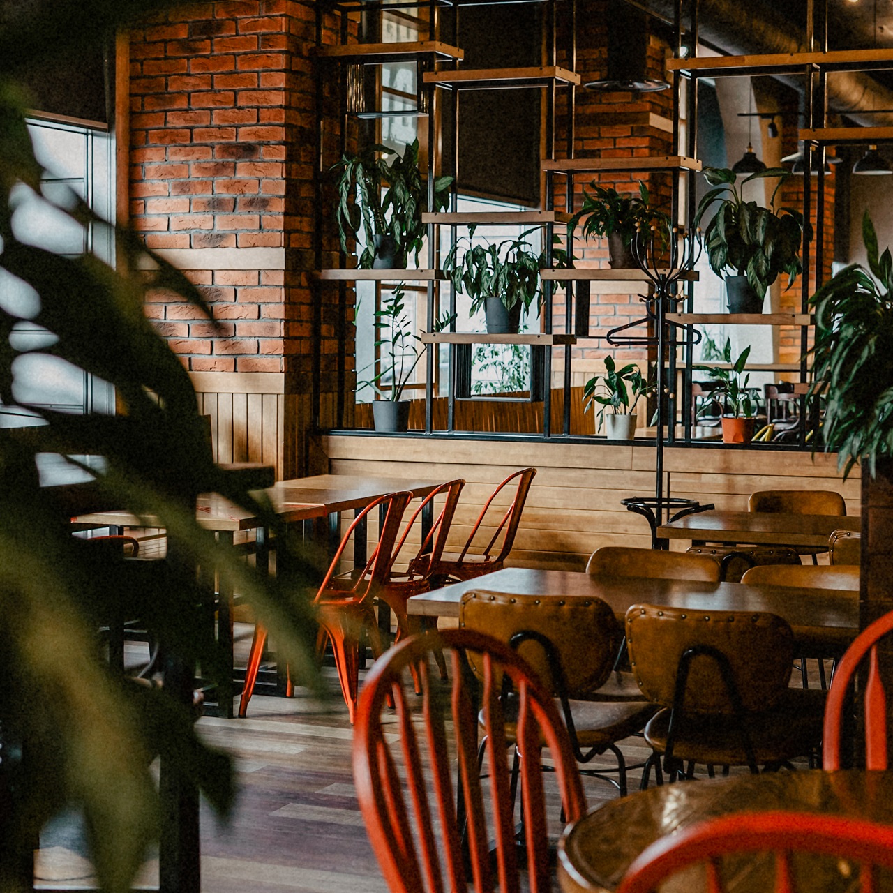 Высокий потолок, фактурные кирпичные стены и панорамные окна. Особый уют создают многочисленные зеленые растения и лампы-гирлянды.