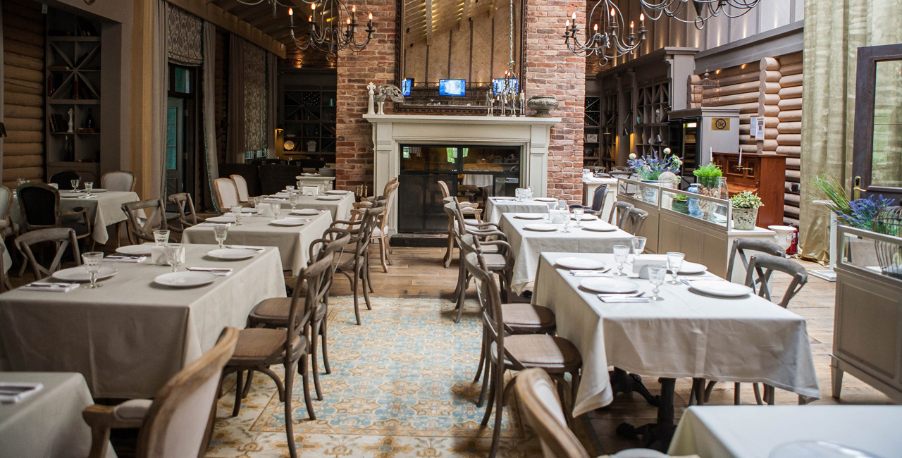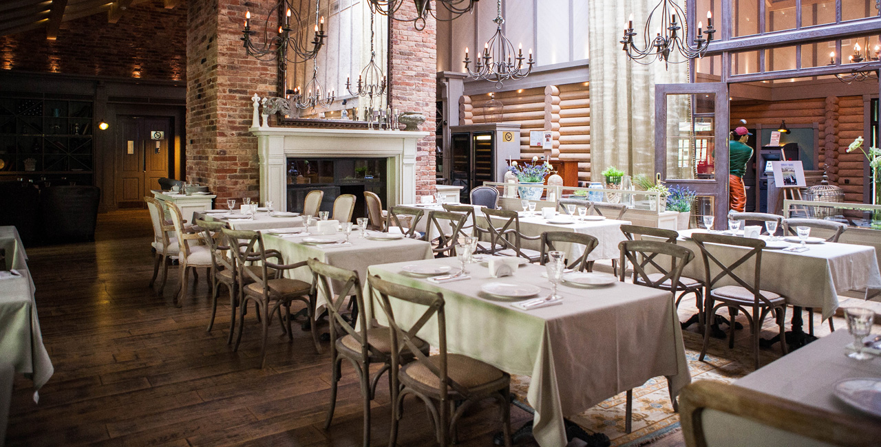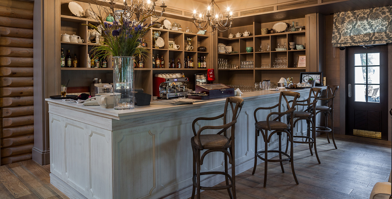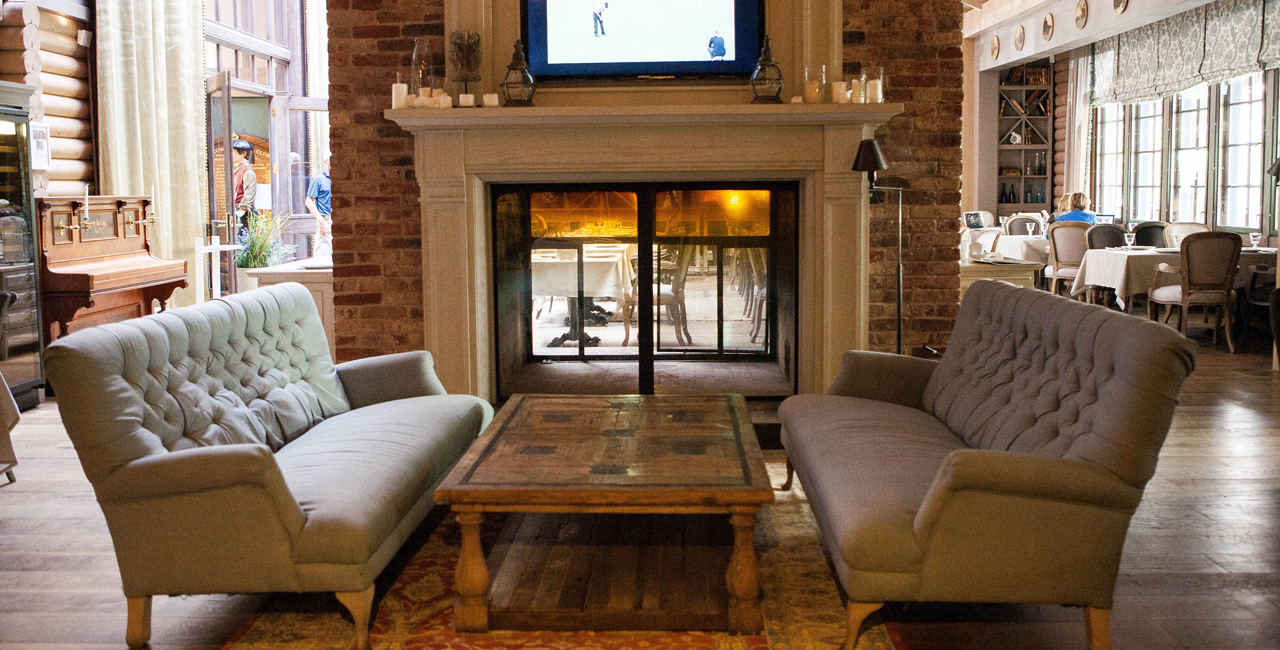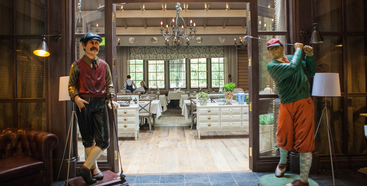 Первый проект Ginza Project в «Москоу Кантри Клаб» - ресторан «Клюшка» - расположен рядом с гольф-клубом, что дополняет атмосферу и эстетику места. Ресторан похож на уютный загородный дом - панорамные окна с видом на поле для гольфа и лес, камин с живым огнем, натуральные материалы в отделке, ковры, дачные цветы и большие люстры-свечи.